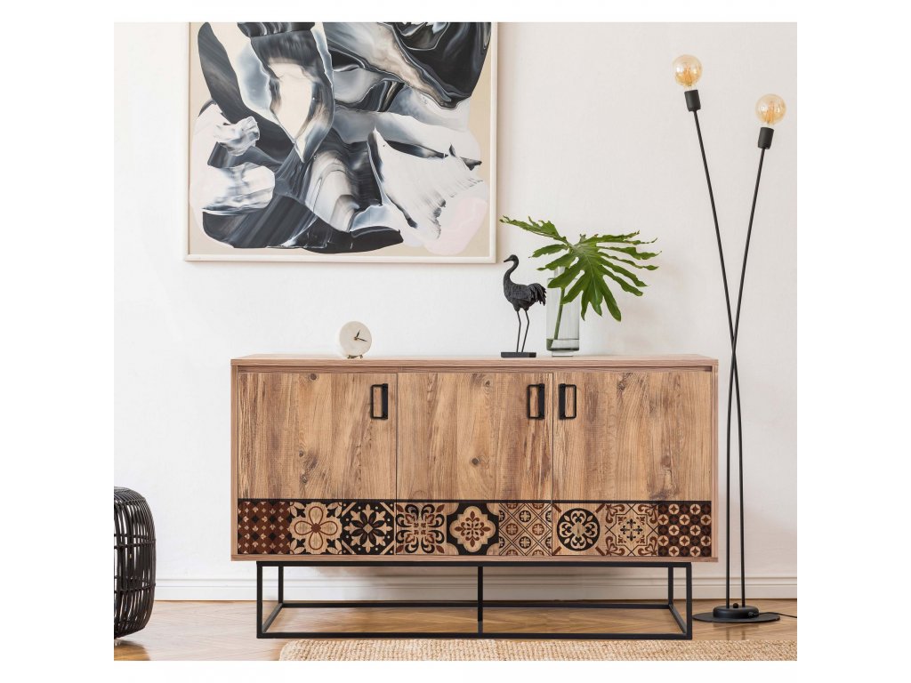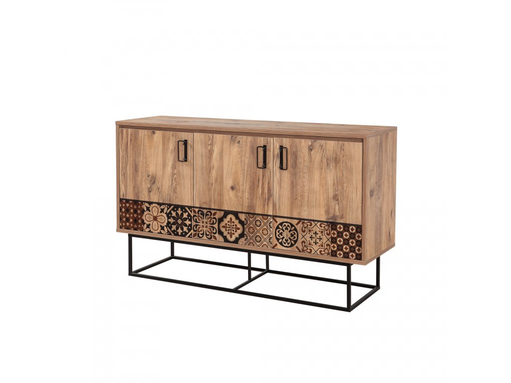 Skříňka QUANTUM je vyrobená v dekoru borovice atlantic doplněného designovým pásem dlaždicových vzorů ve spodní části dvířek, která jsou opatřena černými kovovými úchyty, aby ladily s nosným rámem skříňky.