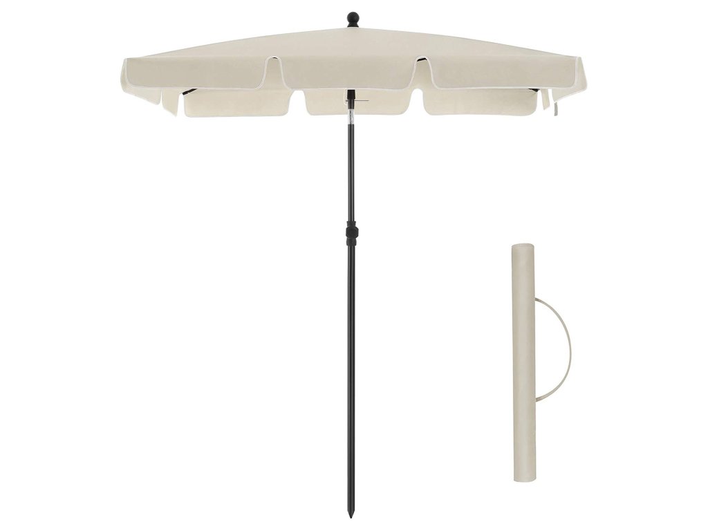 Béžový slunečník s praktickou obdélníkovou střechou, vhodný zejména na balkon