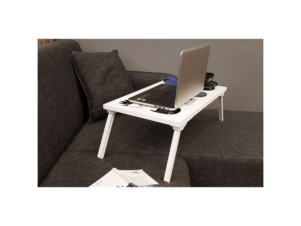 Stolek pod notebook GUSTO má skládací nožky a je vyrobený v bílé barvě s barevným kočičím potiskem.