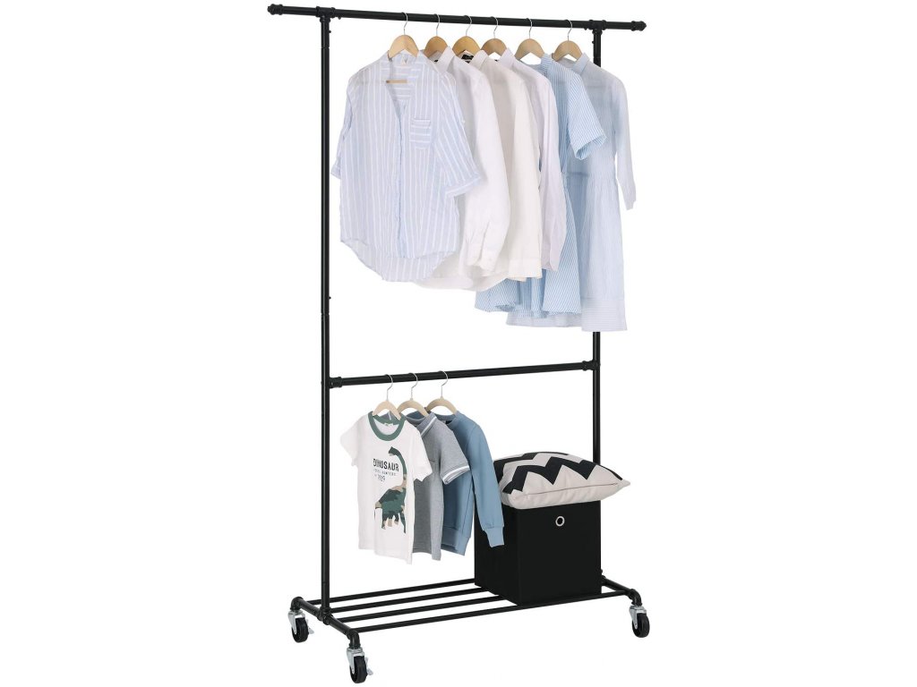 Proměňte svoji ložnici na mini suite s tímto stojanem na šaty. Na dvojitou tyč se vejdou jak šaty, tak trička, protože středová tyč je nastavitelná ve 4 výškách.