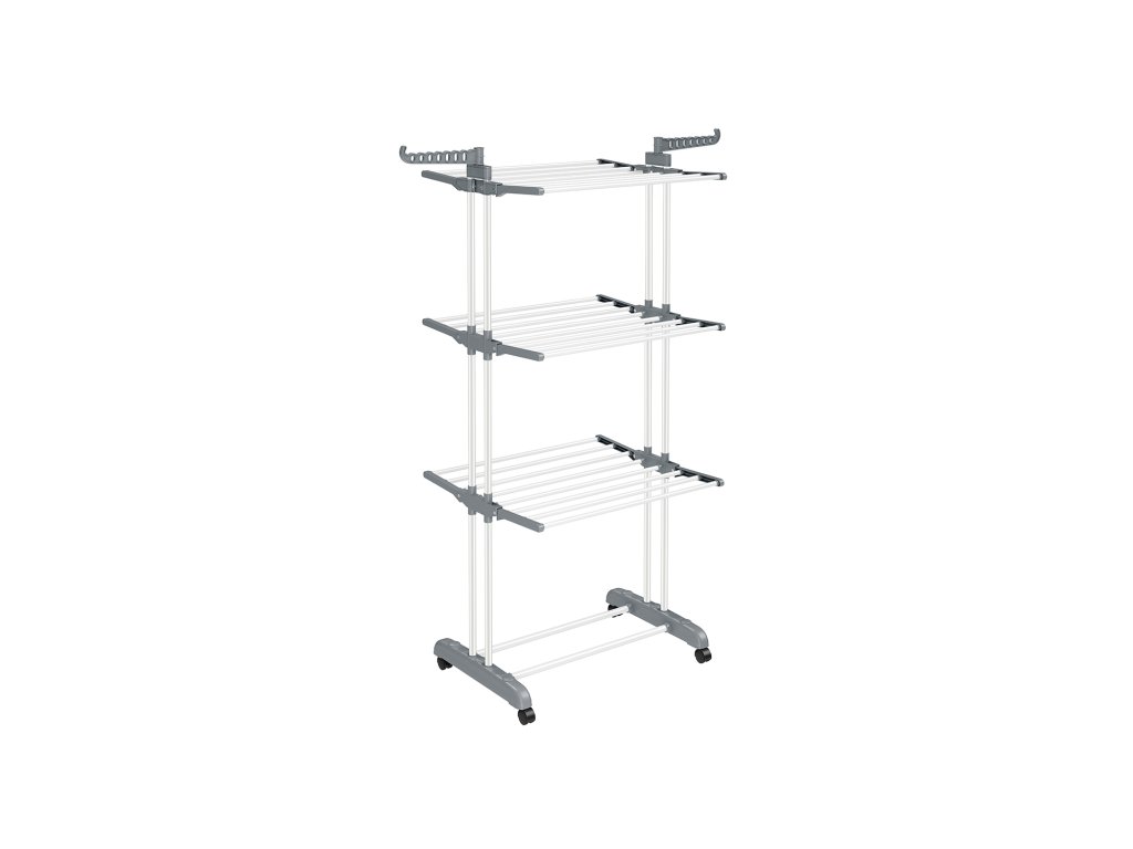 Čtyřpatrový sušák o rozměrech 64 x 126 x 172 cm má 3 horní patra, 2 otočná křídla se 14 otvory a spodní patro na obuv. Je to vaše univerzální řešení pro sušení všeho od ponožek, ručníků, oblečení členů rodiny, přikrývek a dalších věcí.
