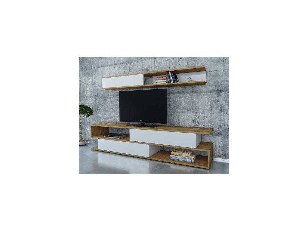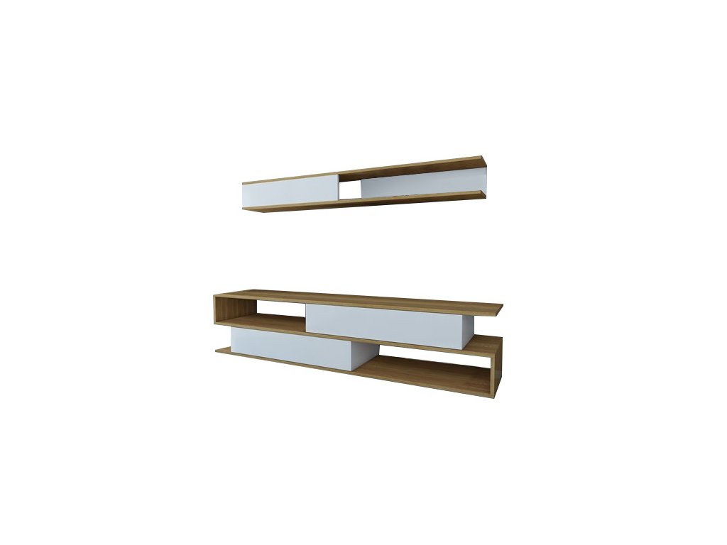 Televizní stěna SIMS má tělo stolku vyrobené v dekoru teak s bílými doplňky a tyto dekory se opakují i na nástěnné polici.