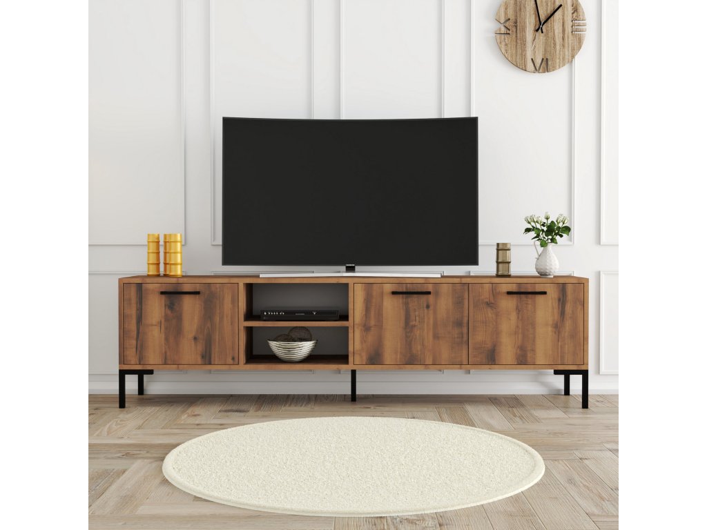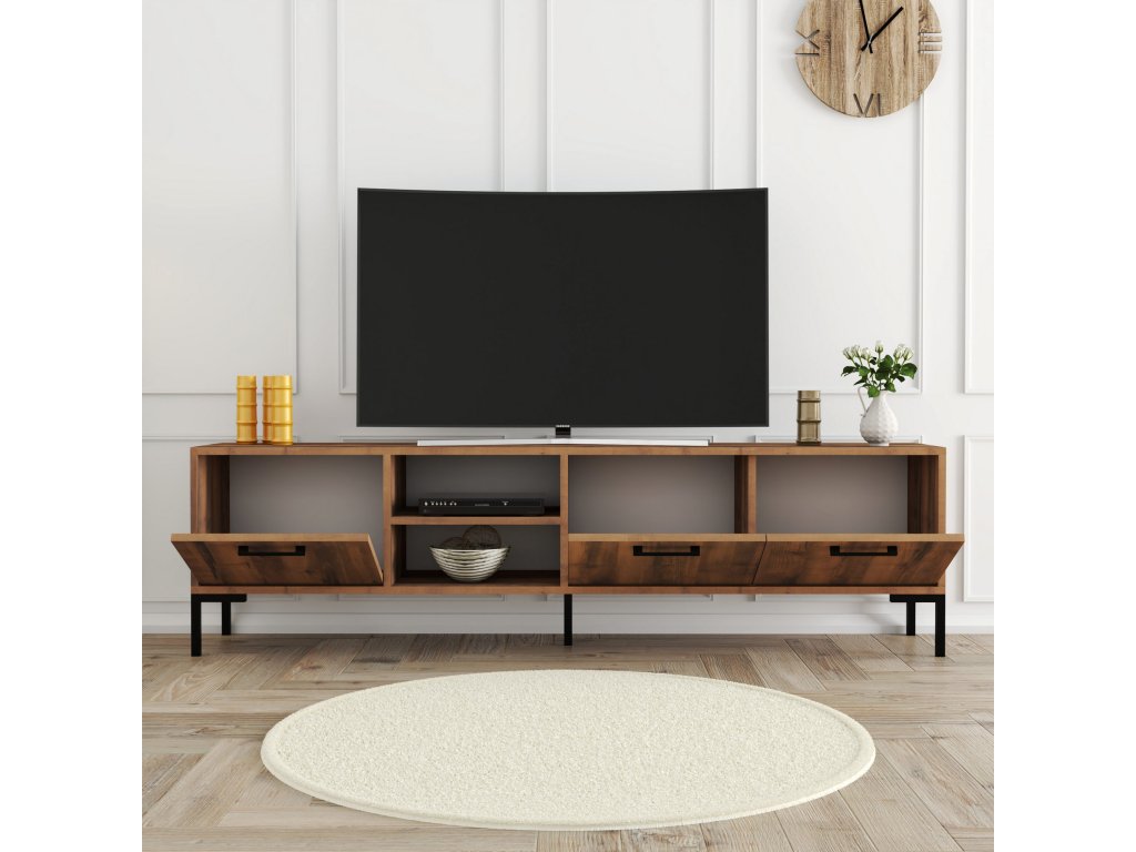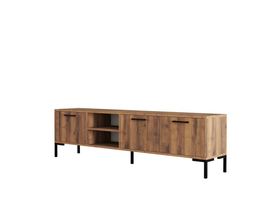 Televizní stolek AURORA je vyroben v dekoru ořecha desku pro televizor doplňuje jeden otevřený regál a tři skříňky s výklopnými dvířky a černými madly.