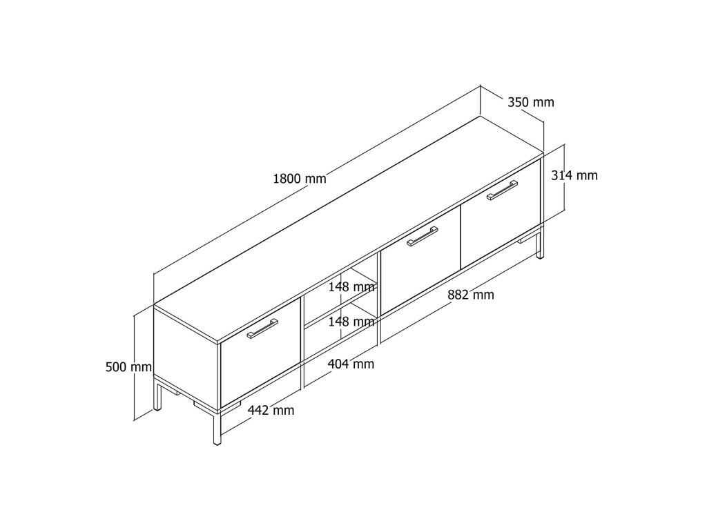 Na kovových černých nožkách stojící televizní stolek AURORA je tvořen třemi skříňkami s výklopnými dvířky s černými madly a otevřeným regálem s policí.
