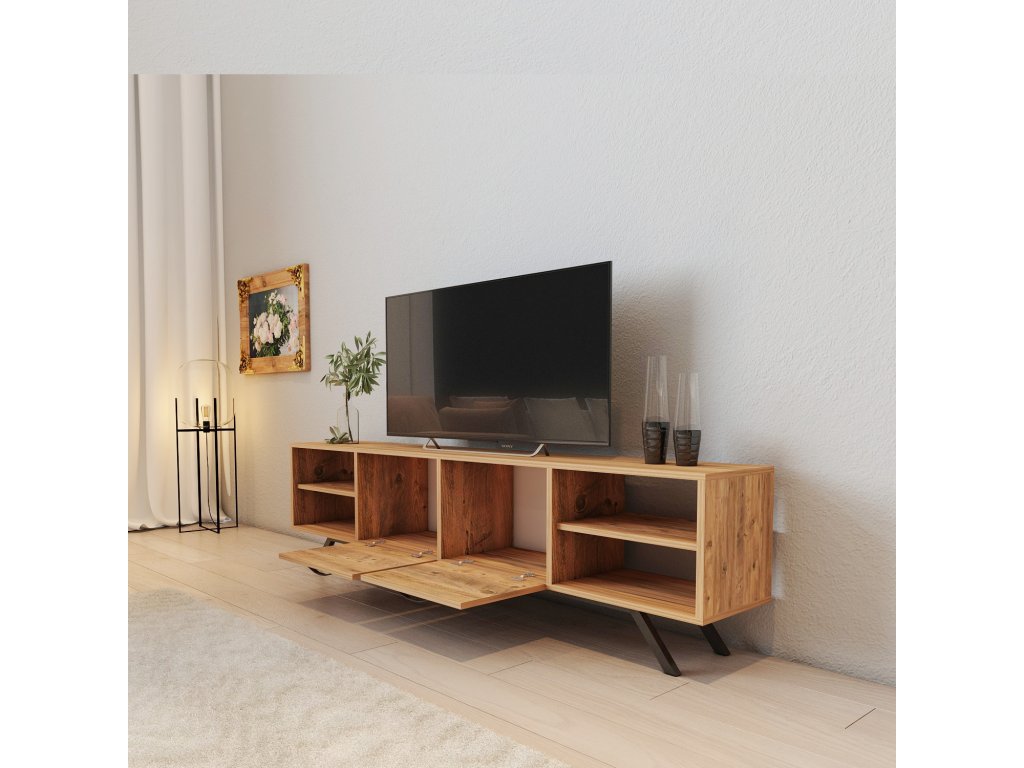 Jednoduchý televizní stolek BETA na kovových nožkách v dekoru ořech s policemi na stranách, uprostřed jsou dva zavřené úložné prostory s výklopnými dvířky.