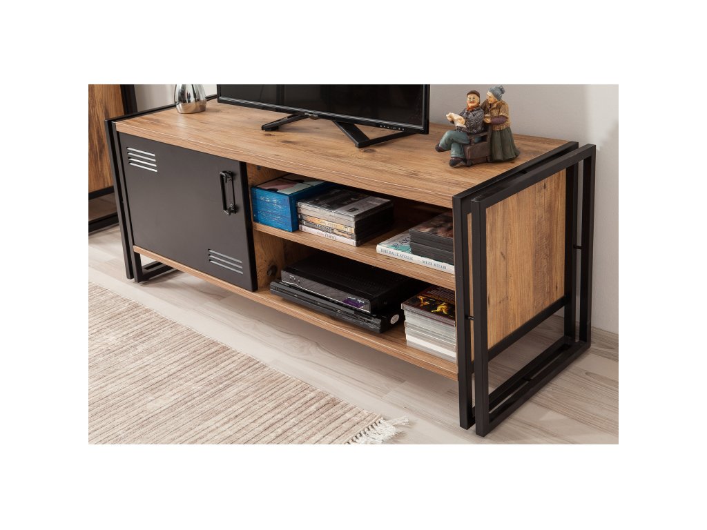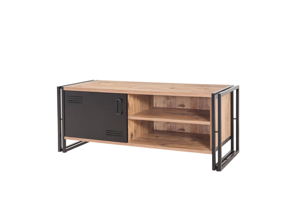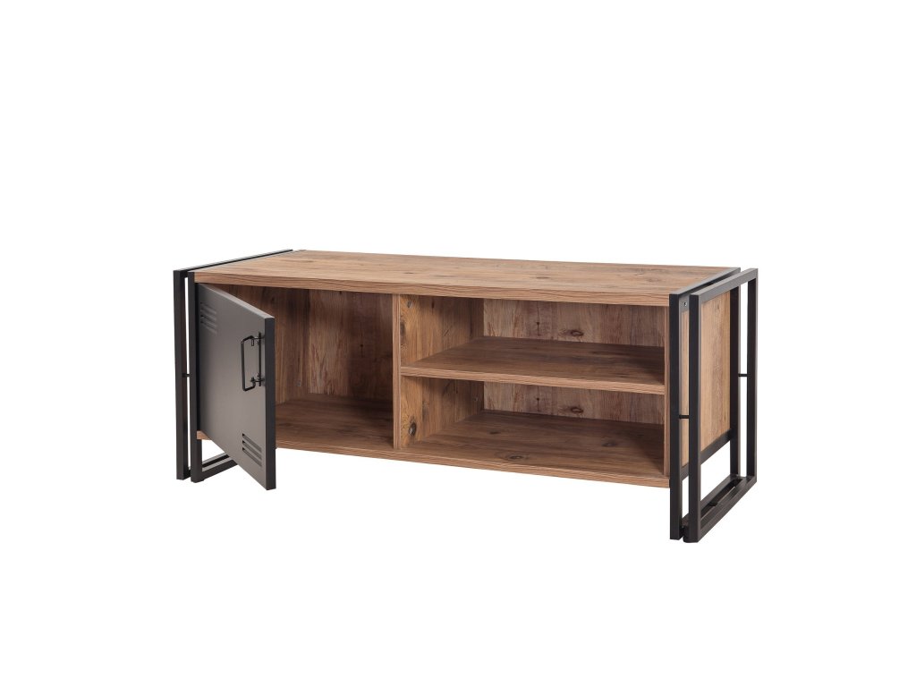 Kolekce KOSMO nabízí řadu tv stolků kombinující dřevo s kovovou konstrukcí a černými dvířky.