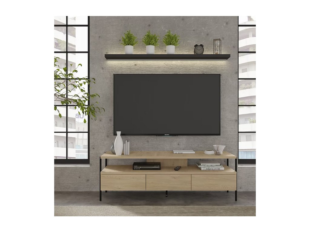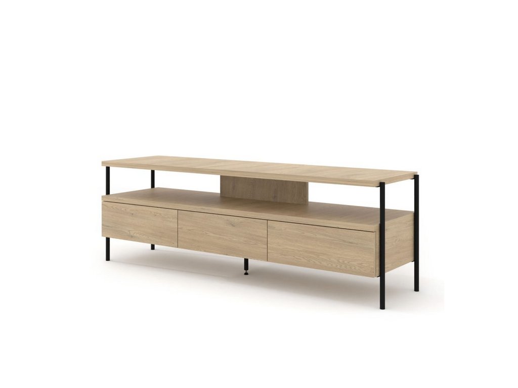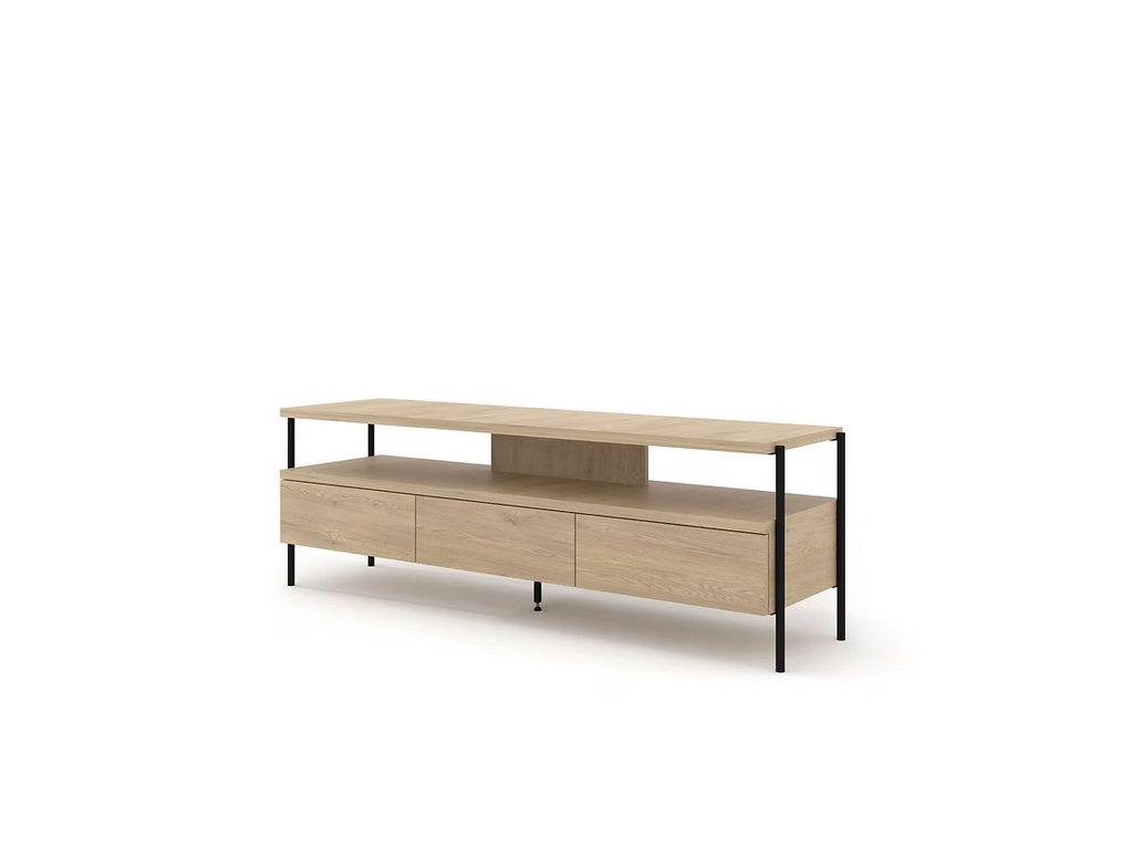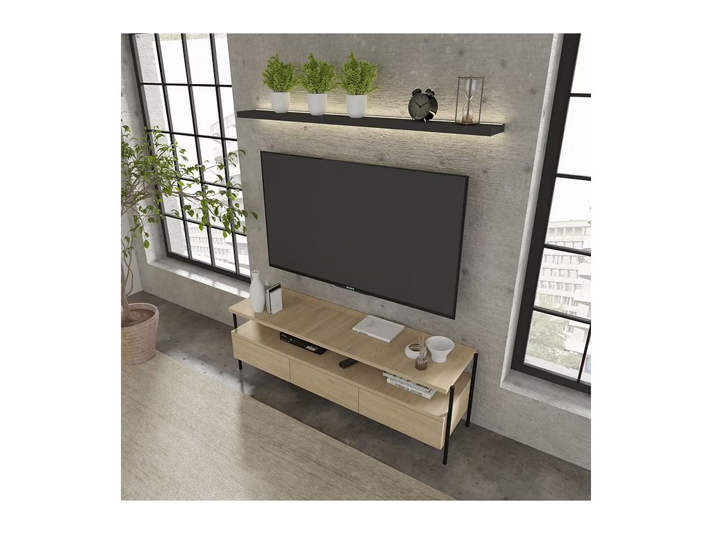 Kombinace teplého dekoru dub cremona s černou kovovou základnou dodává interiéru jedinečný charakter – od strohého loftu po útulný skandinávský styl. Díky nízké konstrukci (výška 51 cm) skříňka zajišťuje optimální úhel sledování televize a její zesílená deska (25 mm) zaručuje stabilní oporu i pro velké obrazovky.