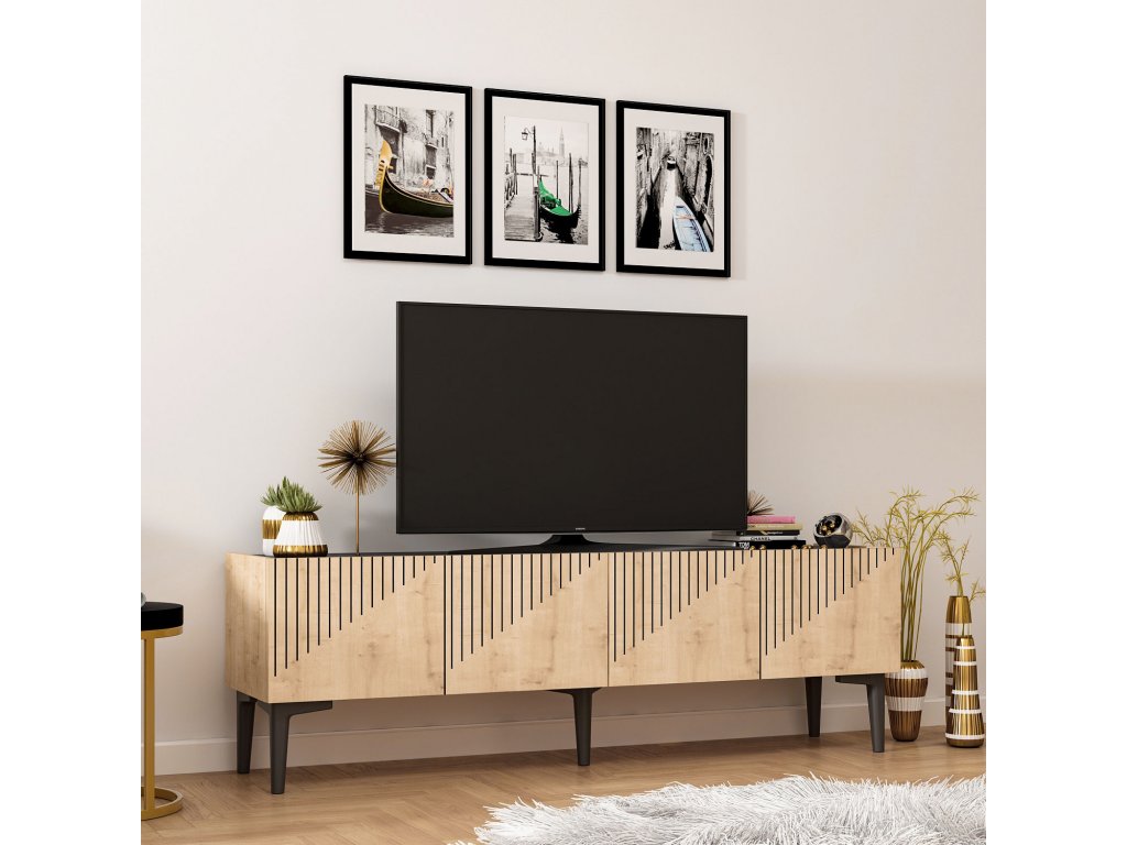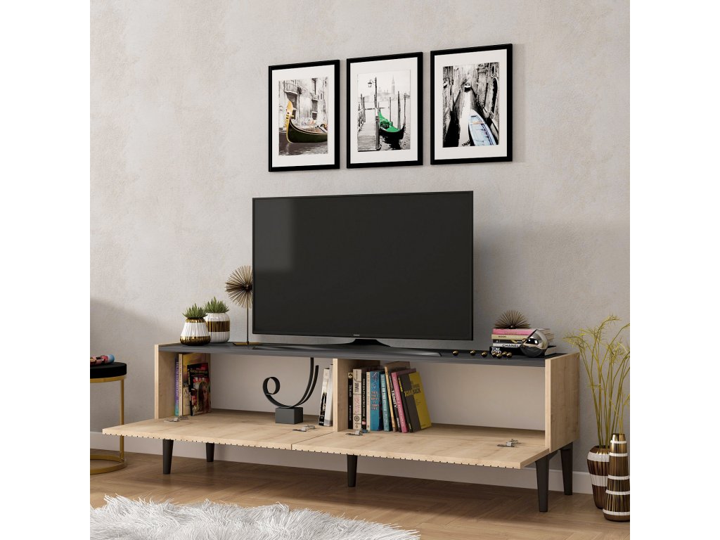 Televizní stolek, který upoutá Vaši pozornost v barevném provedení safírová, dekor dub a černý mramor.