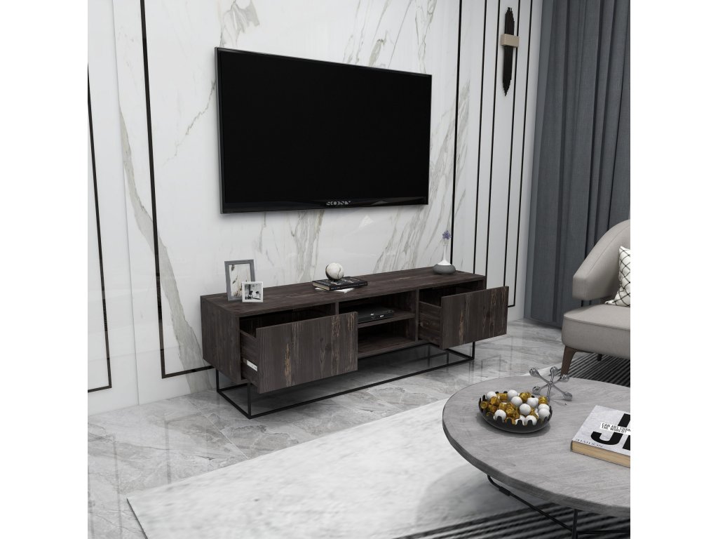 Temně hnědý televizní stolek ESCAPE stojí na kovové konstrukci a je složený z otevřeného regálu a dvou postranních zásuvek.