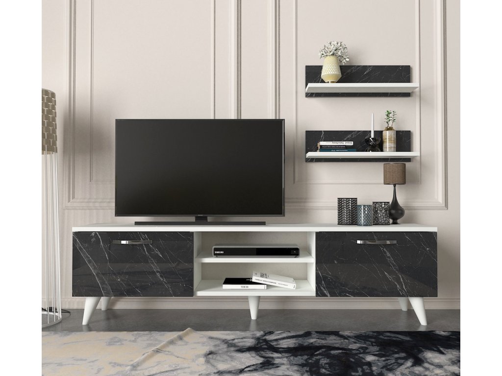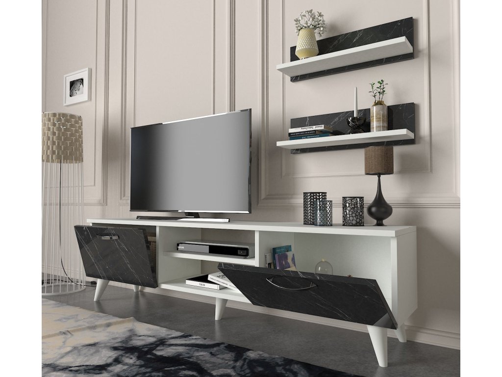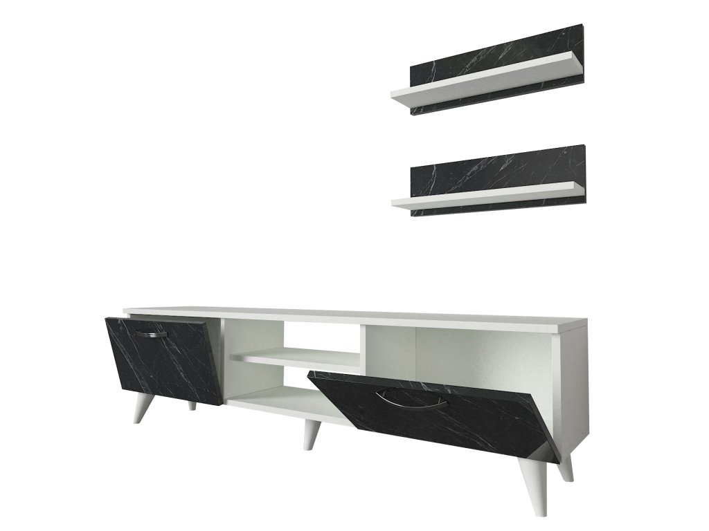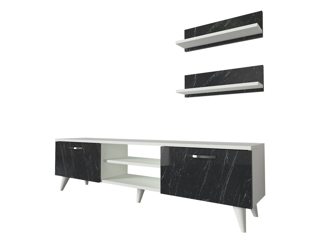 Televizní stolek GEACLES a k němu příslušné 2 nástěnné poličky jsou vyrobeny v bílé barvě a v dekoru tmavého mramoru.