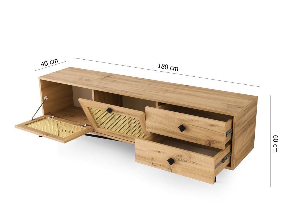 HAPSIAS je prostorný televizní stolek s dvěma úložnými prostory a dvěma zásuvkami.