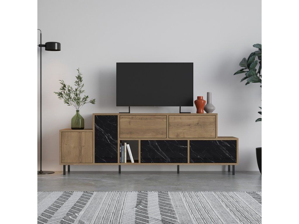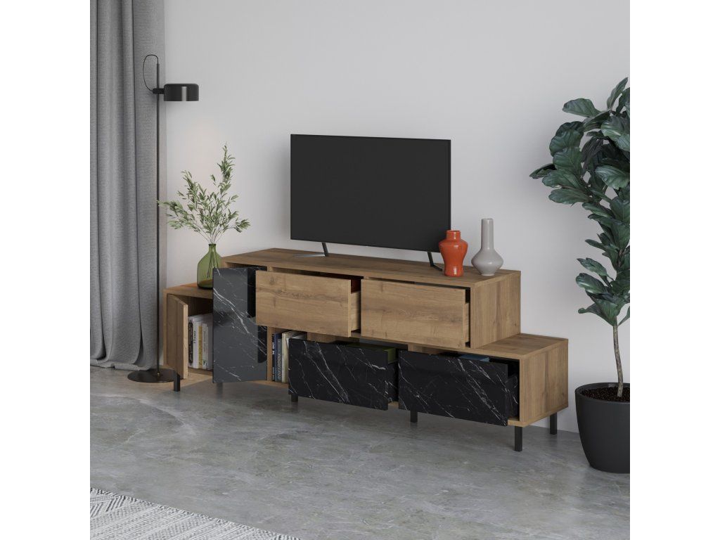 Televizní stolek HERMES je vyrobený v elegantní kombinaci dekorů dub a černý mramor a nabízí kromě desky pro televizor i čtyři zásuvky, dvě skříňky a jeden otevřený regál.