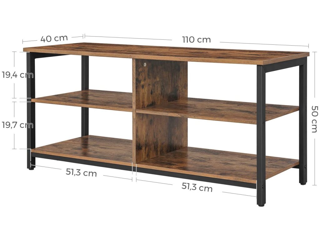 Jednoduchý televizní stolek s policemi v industriálním designu, hnědé barvě o rozměrech 110 x 40 cm