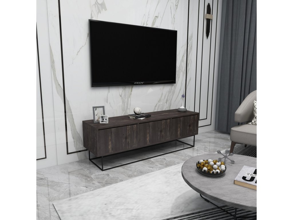 Televizní stolek KORDON stojící na černé kovové konstrukci je vyrobený v elegantní hnědé barvě a je složen ze tří zásuvek.