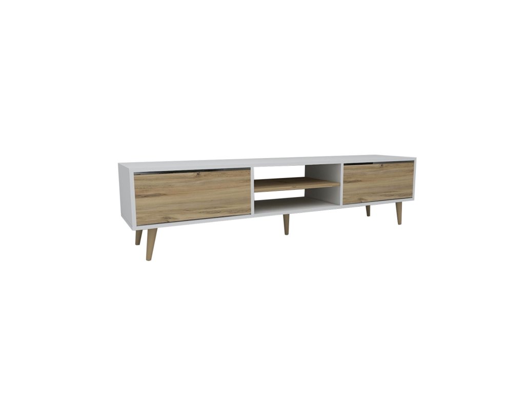 Televizní stolek KRAF je vyrobený v bílé barvě s regálem a zásuvkami v dekoru dub.