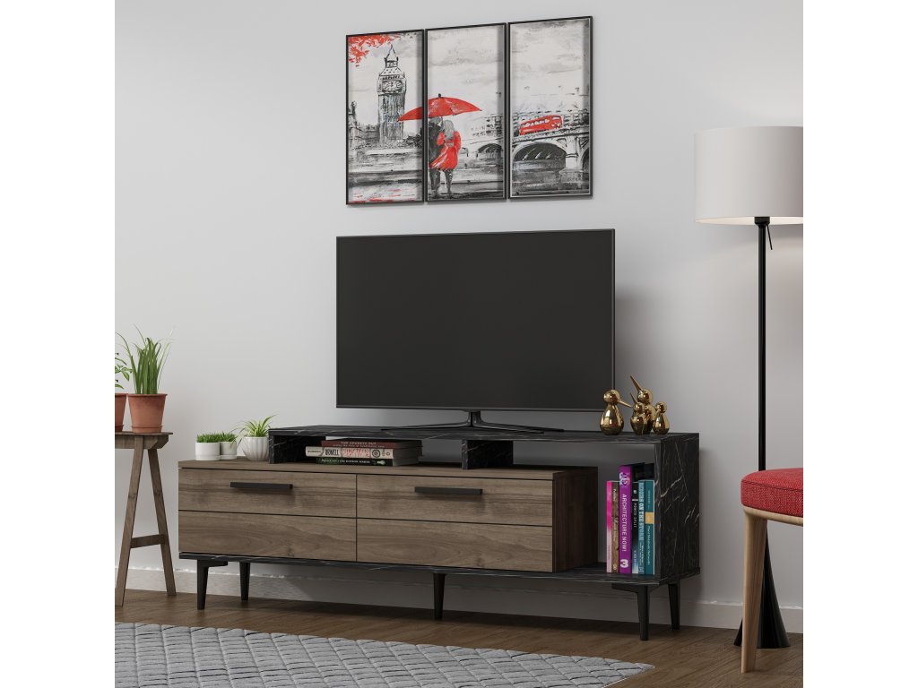 Moderní designový televizní stolek NIVA nabízí otevřený i uzavřený úložný prostor v kombinaci dekorů ořech a černý mramor doplněných o černé nožky a madla dvířek.