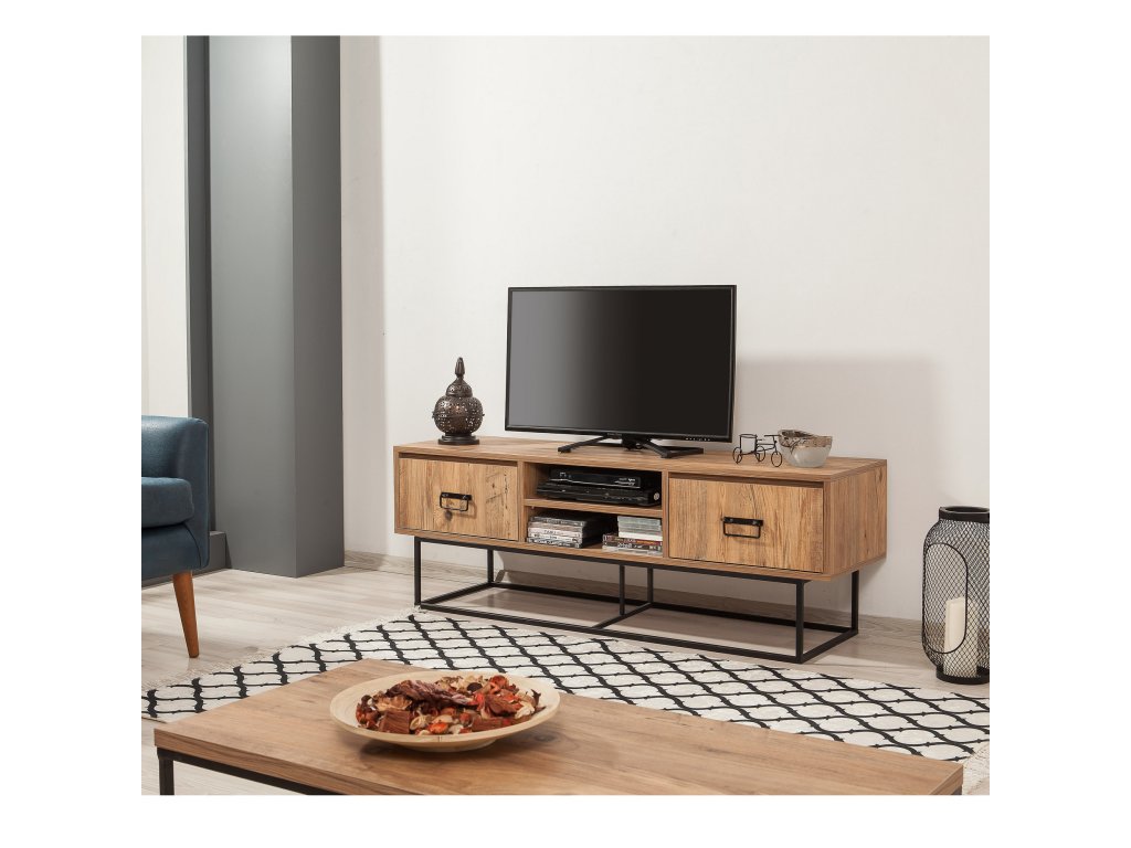 Televizní stolek o šířce 140 cm s kovovou konstrukcí a úložným prostorem.
