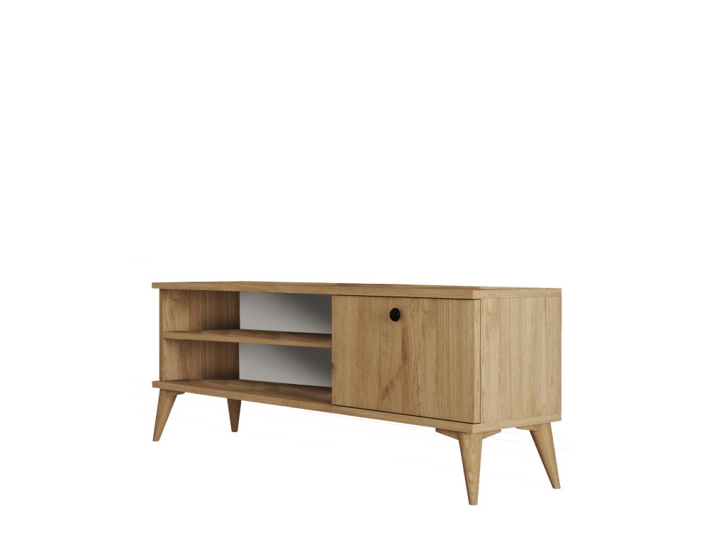 Televizní stolek RETRO stojící na dřevěných nožkách je vyrobený v dekoru dub z jednoho regálu a jedné skříňky s výklopnými dvířky.
