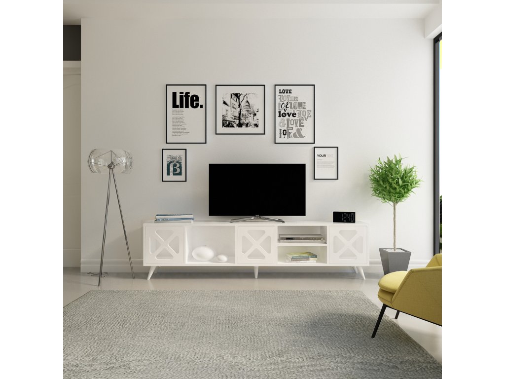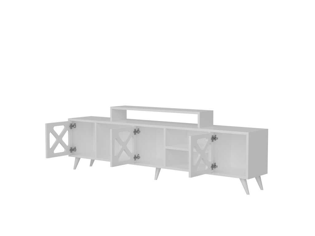 Atraktivní televizní stolek v bílé barvě, který má otevřený i uzavřený úložný prostor a troje dvířka s designem čtyřlístku.