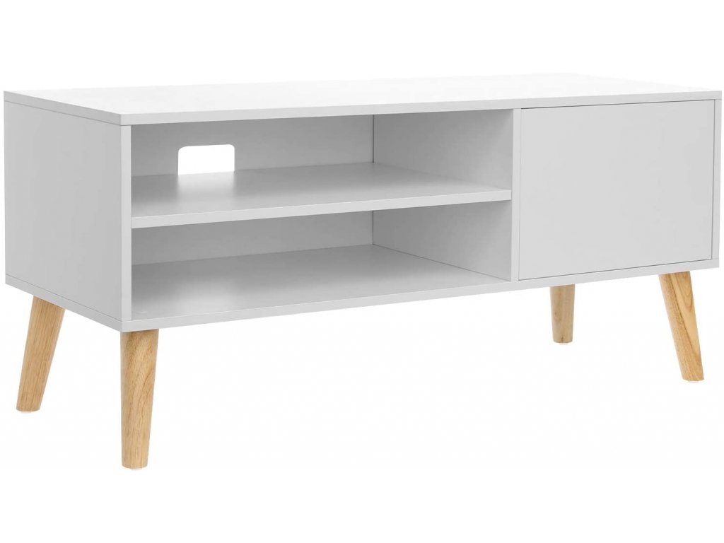 Malý bílý televizní stolek ve skandinávském designu se hodí do menších designových obývacích pokojů