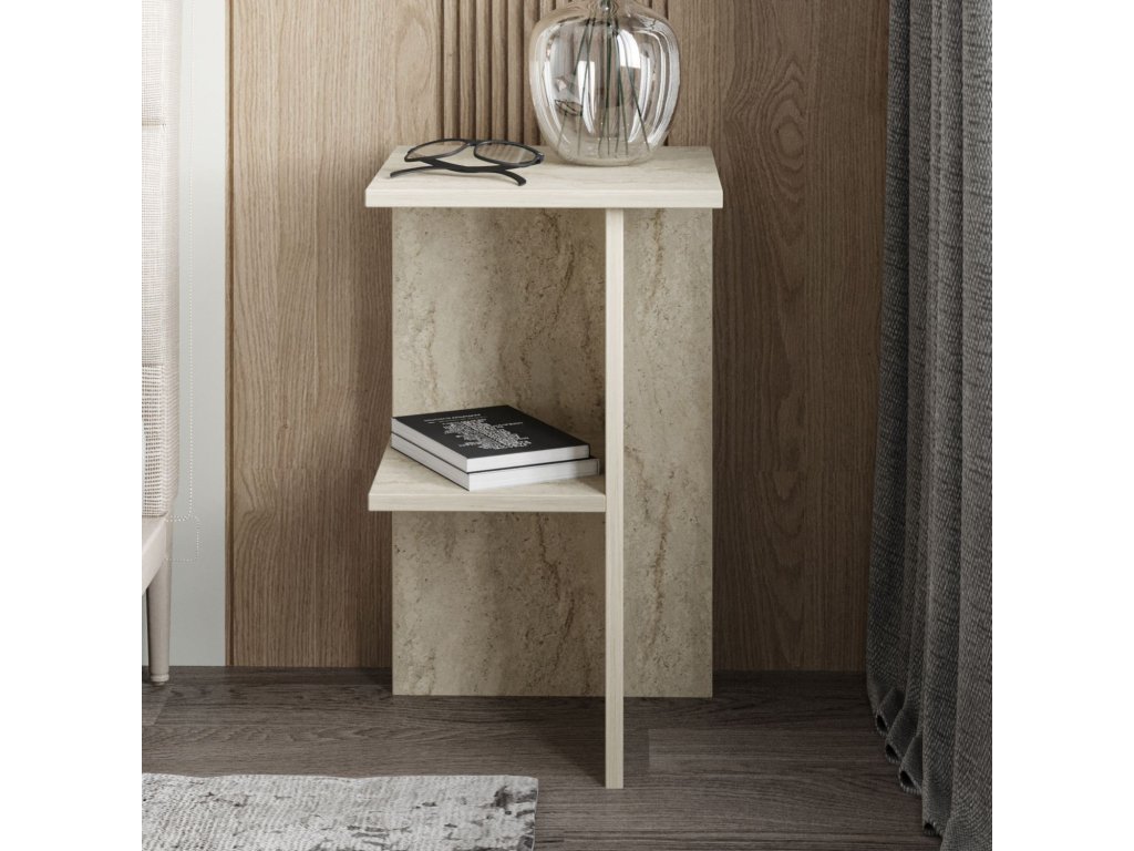 Noční stolek z travertinu je vyroben ze 100% melaminem potažené dřevotřísky, což zajišťuje jeho odolnost a dlouhou životnost. Tloušťka 18 mm přispívá k jeho pevnosti, což z něj činí spolehlivý doplněk vaší ložnice. Elegantní design tohoto nočního stolku doplní jakýkoli interiér a zároveň poskytne dostatek úložného prostoru pro vaše noční nezbytnosti.