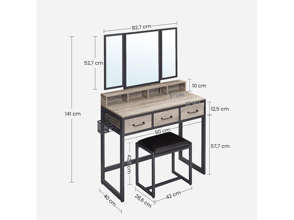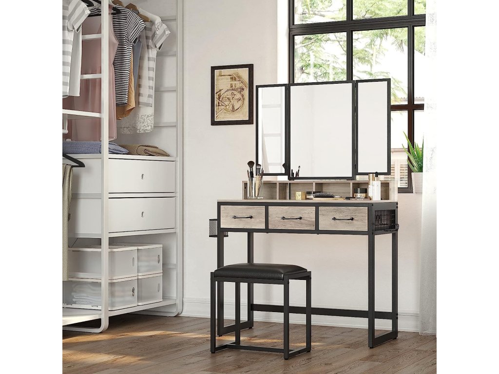 Toaletní stolek s trojitým zrcadlem, vyrobený z dřevotřísky a robustní oceli a polstrovaná stolička, na které se můžete pohodlně připravovat