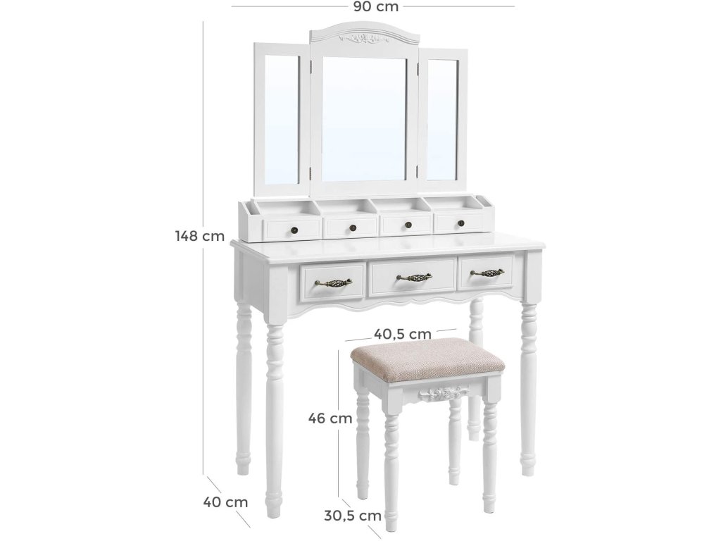 Krásný toaletní stolek s praktickou stoličkou ve stejném designu. Obsahuje mnoho prostorných zásuvek, kam si schováte všechny svoje toaletní potřeby.