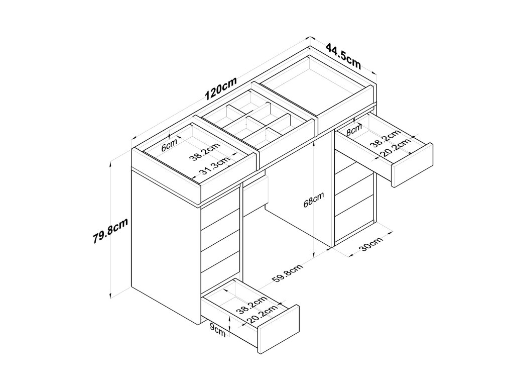 Náš kosmetický stolek je vyroben ze 100% melaminované dřevotřísky kvality e1 a vydrží dlouho. Tloušťka 18 mm zajišťuje robustnost a stabilitu, takže jej můžete bez obav používat každý den bez obav z opotřebení.