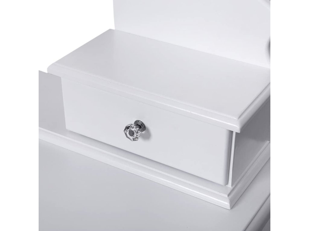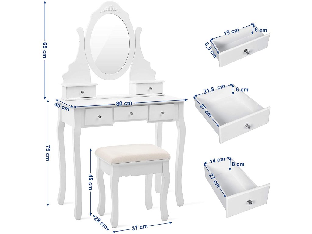 Krásný toaletní stolek s praktickou stoličkou a zrcadlem ve stejném designu. Obsahuje mnoho prostorných zásuvek, kam si schováte všechny svoje toaletní potřeby.