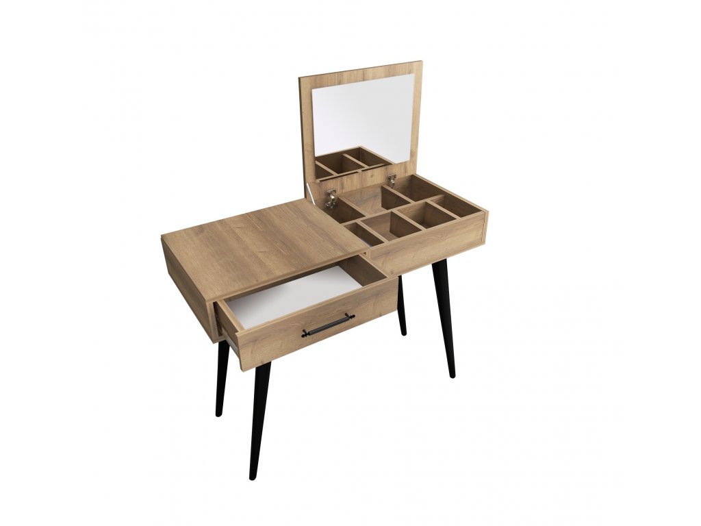Na černých dřevěných nohách stojící komplexní v dekoru dub vyrobený toaletní stolek ROUGE nabízí svým moderním designem rozličné úložné prostory, teleskopickou zásuvku a sklopné zrcadlo.