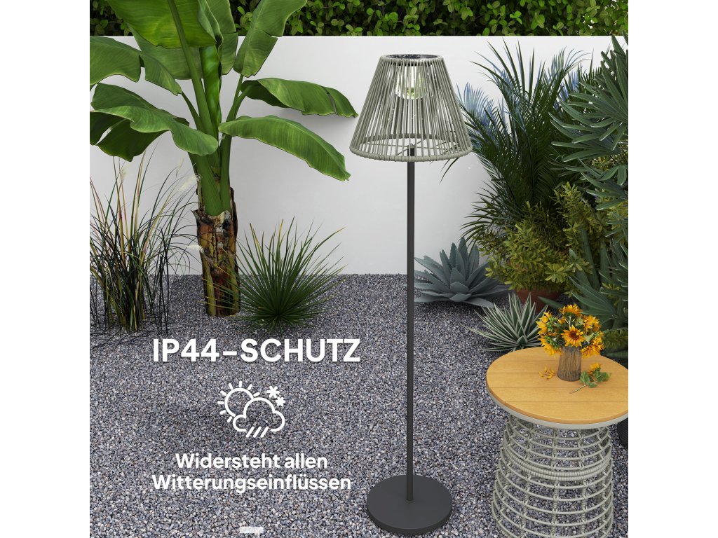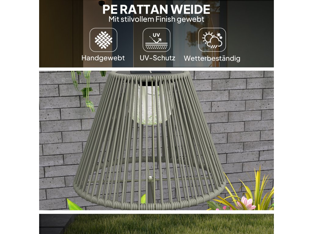 - Elegantní venkovní lampa: Tato stylová volně stojící ratanová solární lampa s ručně tkaným ratanovým stínidlem a elegantní tyčí poskytuje měkké světlo o svítivosti 15 lumenů, které je ideální pro osvětlení zahrad a cest.