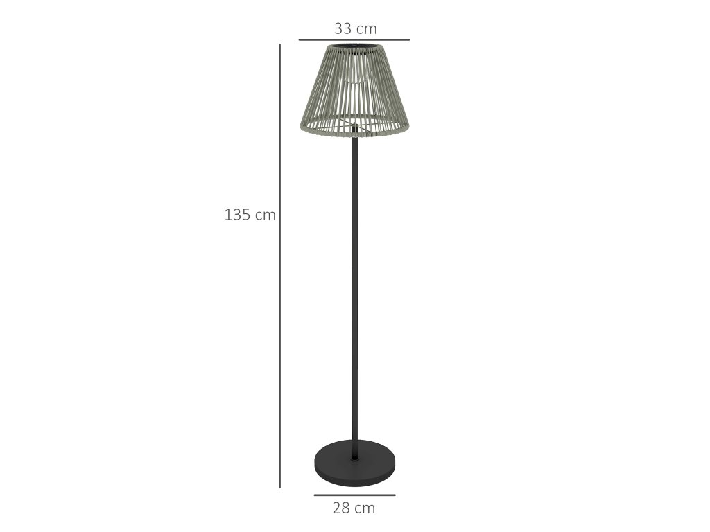 - Celkové rozměry venkovní lampy: Ø33 x 135V cm. Rozměry podstavce: Ø28 x 2,5H cm. Velikost solárního panelu: Ø12 x 2,8T cm. Stupeň vodotěsnosti: IP44. Nutná montáž.