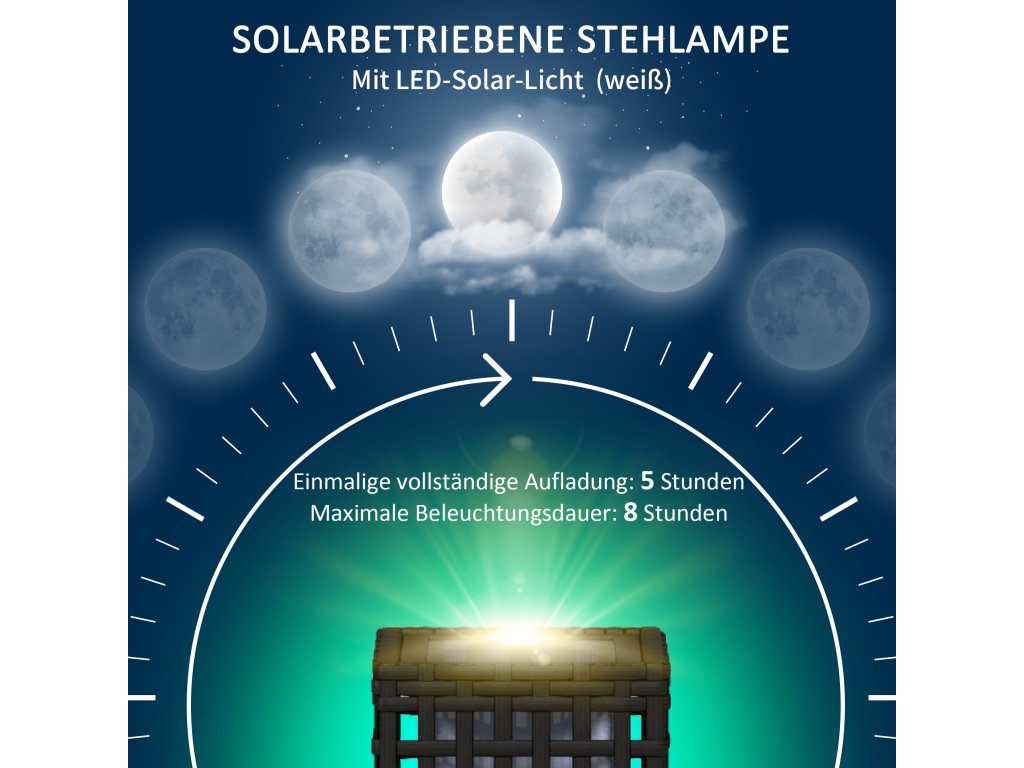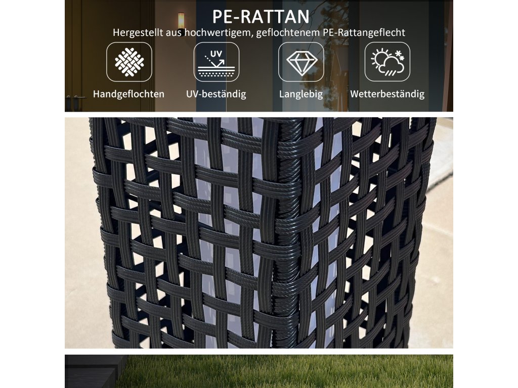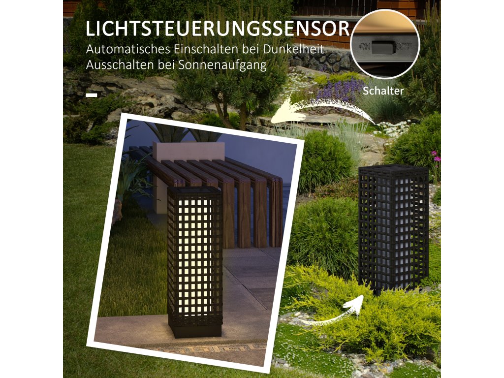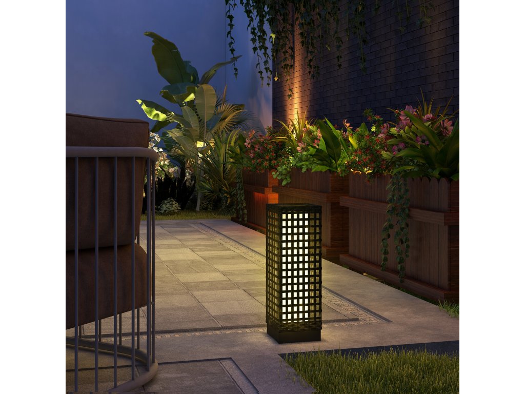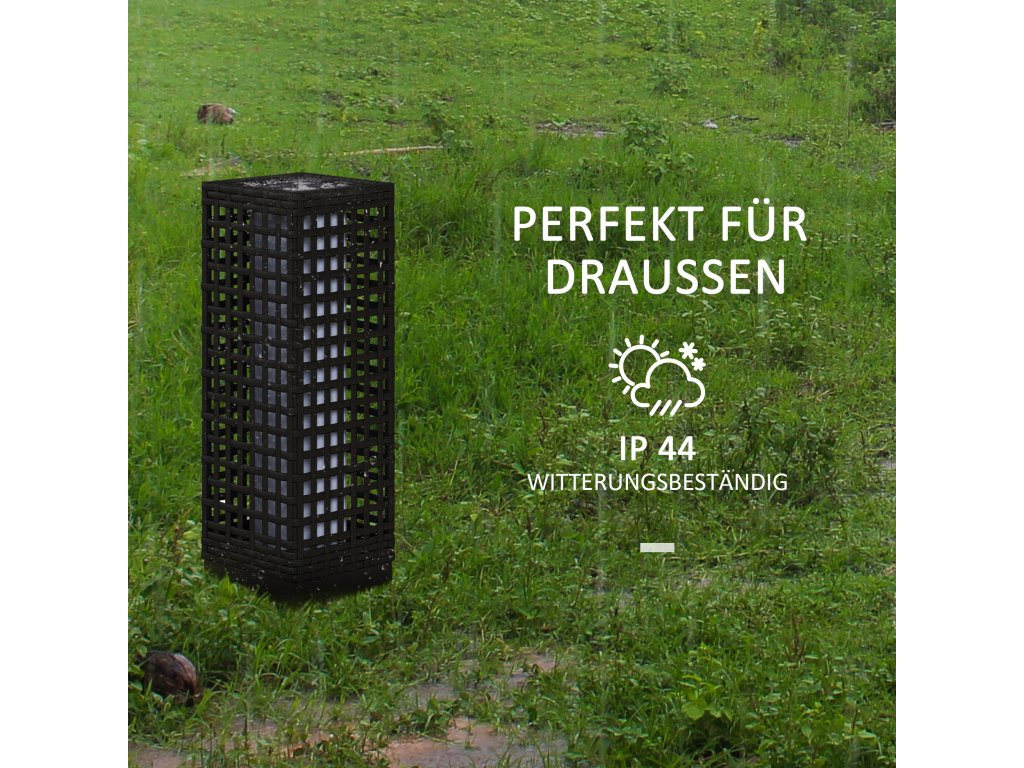 - Venkovní světlo v ratanovém vzhledu: Tato dekorativní stojací lampa vrhá nové, útulné světlo do vašeho venkovního prostoru. Rustikální vzhled přírodního ratanu se hodí na každou zahradu nebo terasu, zatímco svítivost 15 lumenů je ideální pro noční osvětlení.