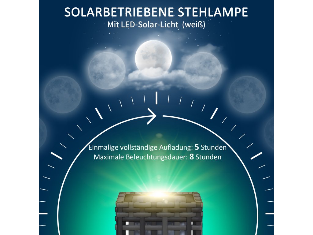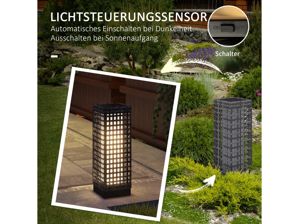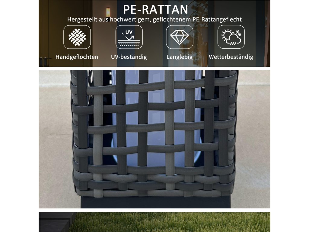 - Venkovní světlo v ratanovém vzhledu: Tato dekorativní stojací lampa vrhá nové, útulné světlo do vašeho venkovního prostoru. Rustikální vzhled přírodního ratanu se hodí na každou zahradu nebo terasu, zatímco svítivost 15 lumenů je ideální pro noční osvětlení.