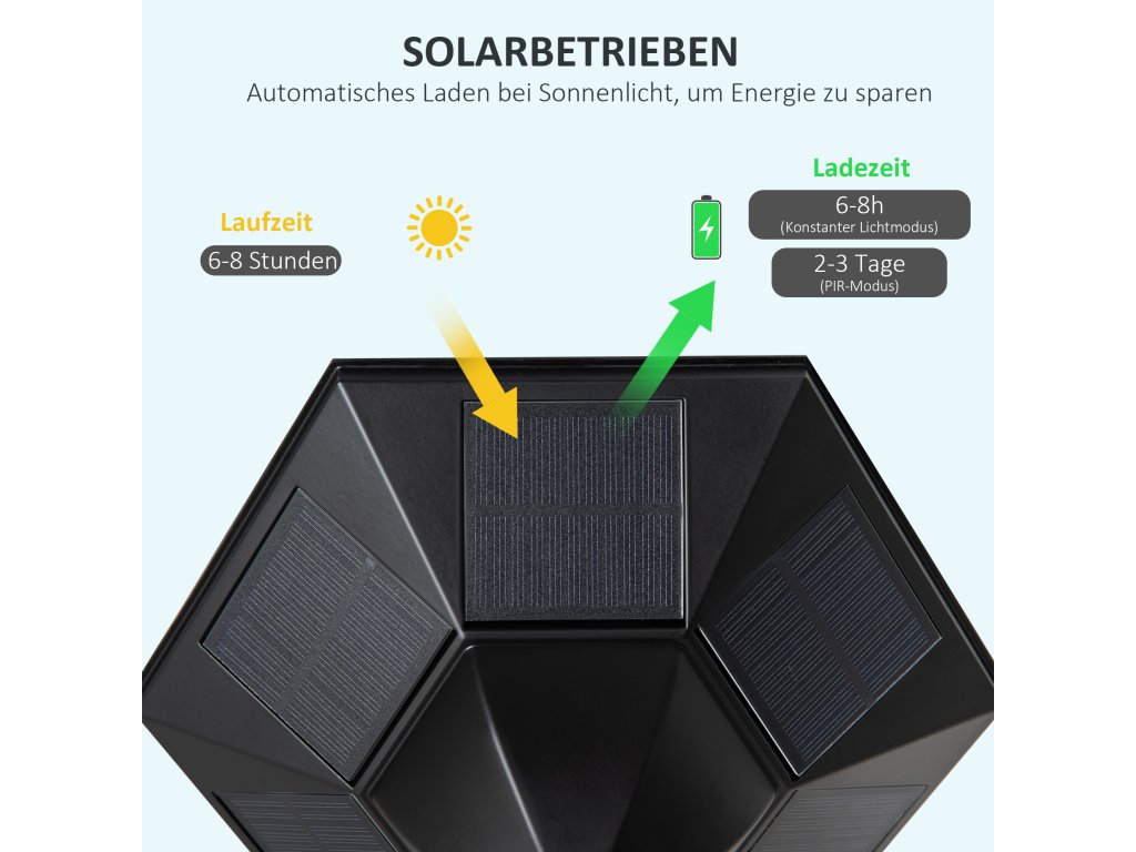 - SOLÁRNÍ PROVOZ: Venkovní světlo se automaticky nabíjí při slunečním svitu, čímž šetří energii. Proces nabíjení trvá 6-8 hodin a po plném nabití lze světlo používat 6-8 hodin (režim nepřetržitého svícení) nebo 2-3 dny (režim PIR).