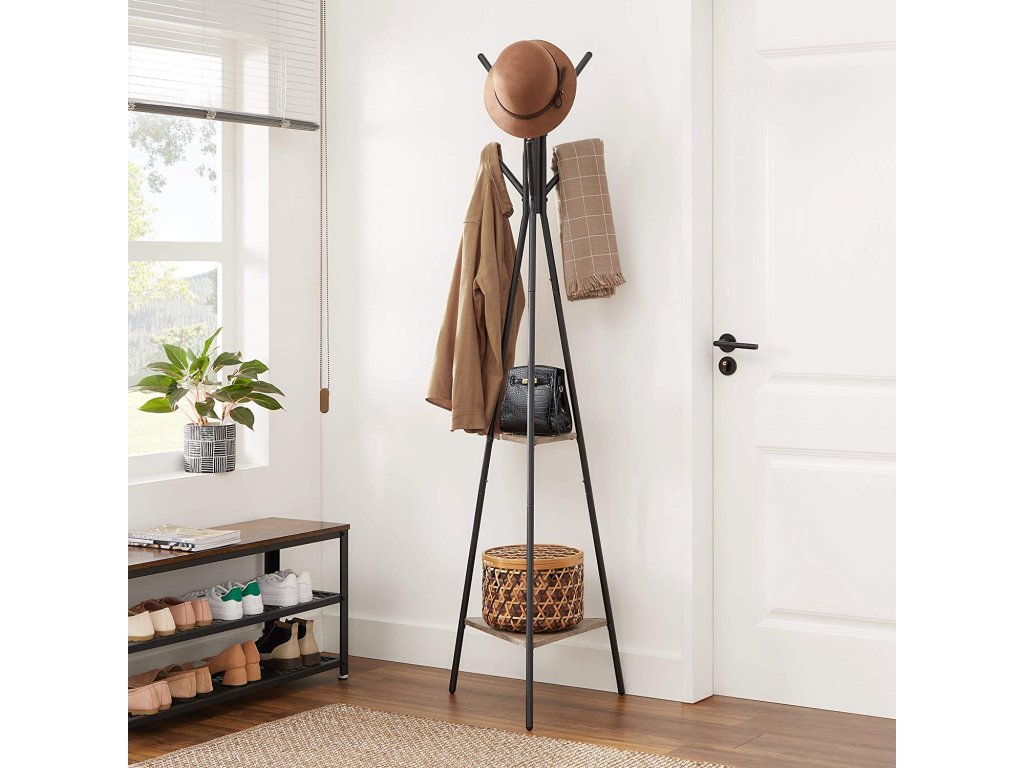 Kovový věšák VASAGLE se dvěma trojúhelníkovými policemi, kam si můžete odložit například deštník, klobouk nebo tašku.