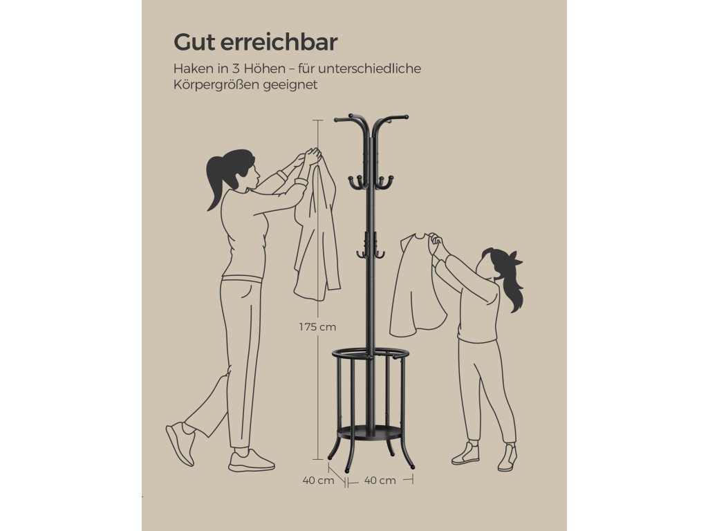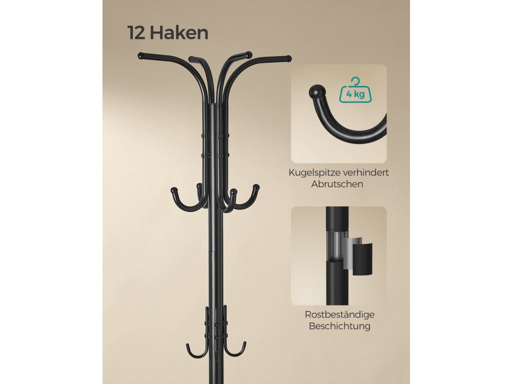 Konstrukce věšáku se skládá ze 4 nohou a má nízké a stabilní těžiště. Kabáty tak můžete bez obav zavěsit na 12 háčků (nosnost jednoho háčku: 4 kg).