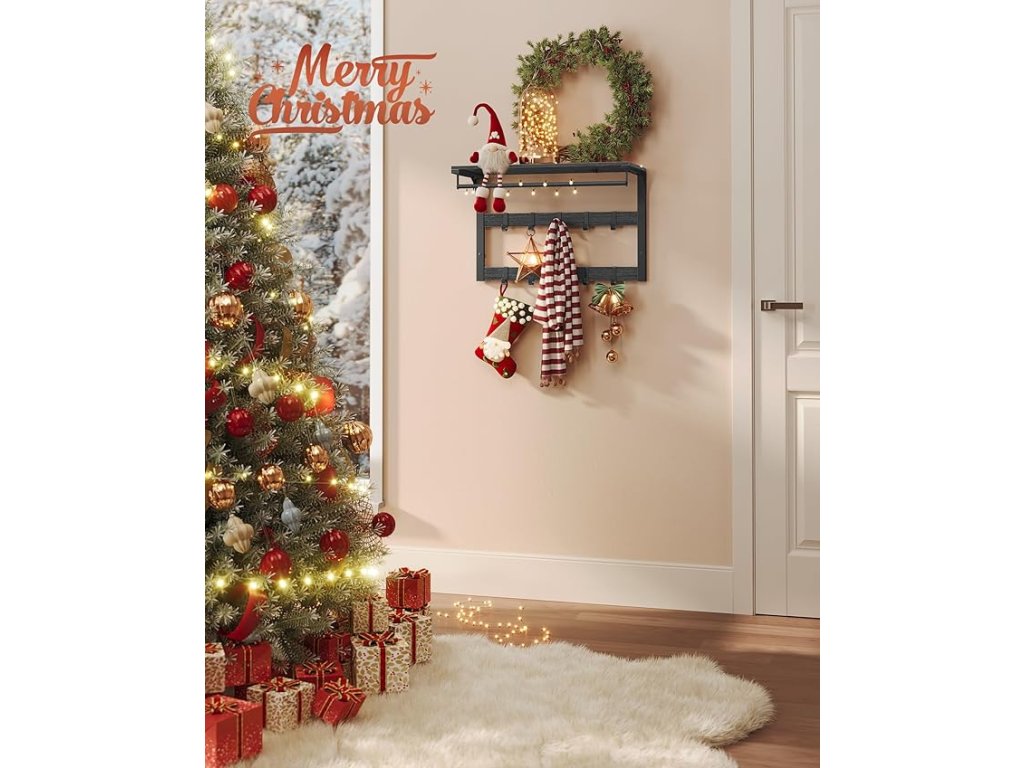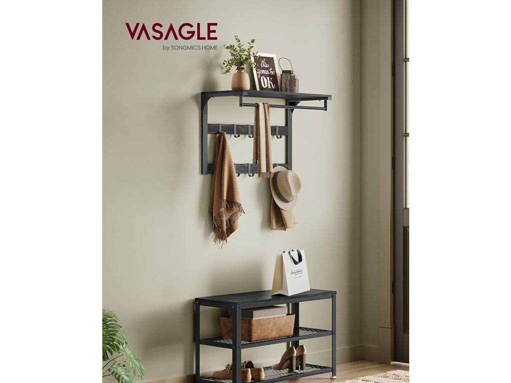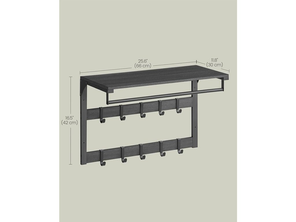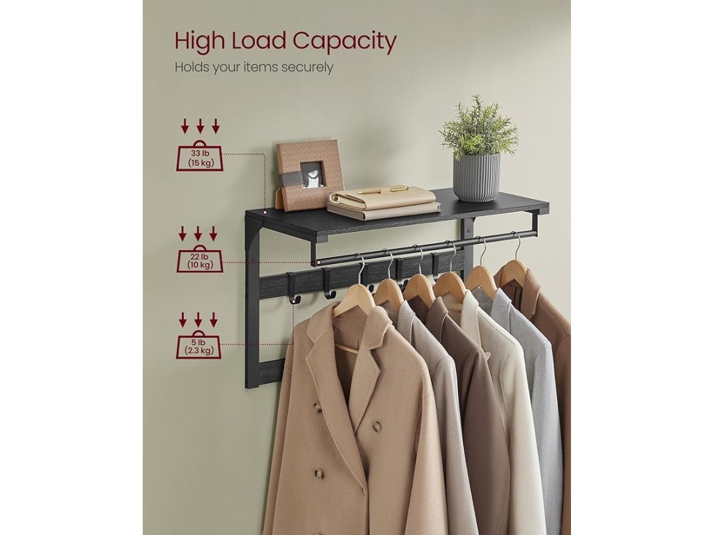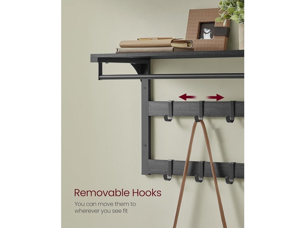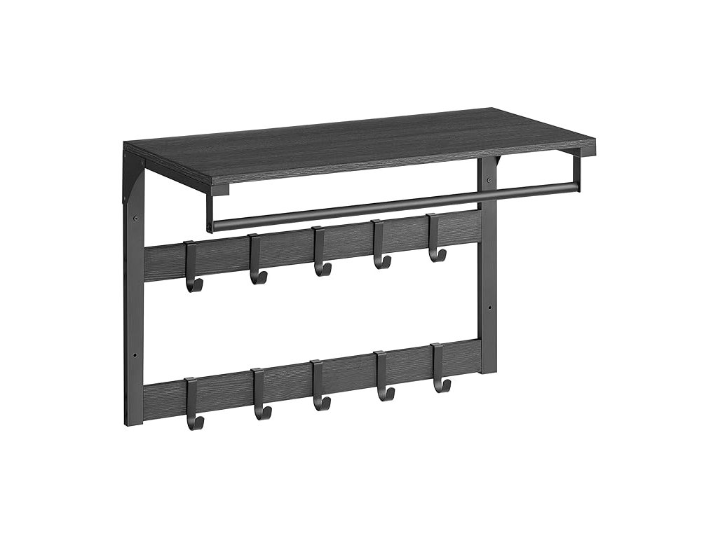 Díky horní polici, odnímatelným háčkům a závěsné tyči kombinuje tento nástěnný věšák úložný prostor, věšení oblečení a ukládání drobných předmětů do jednoho celku.