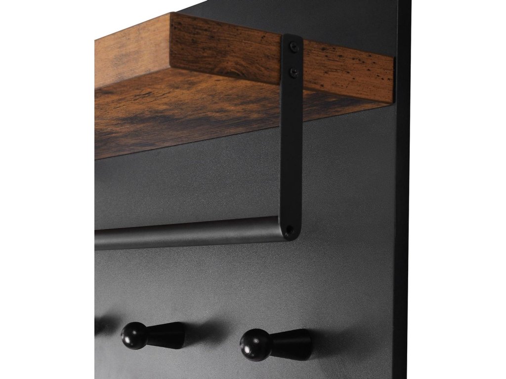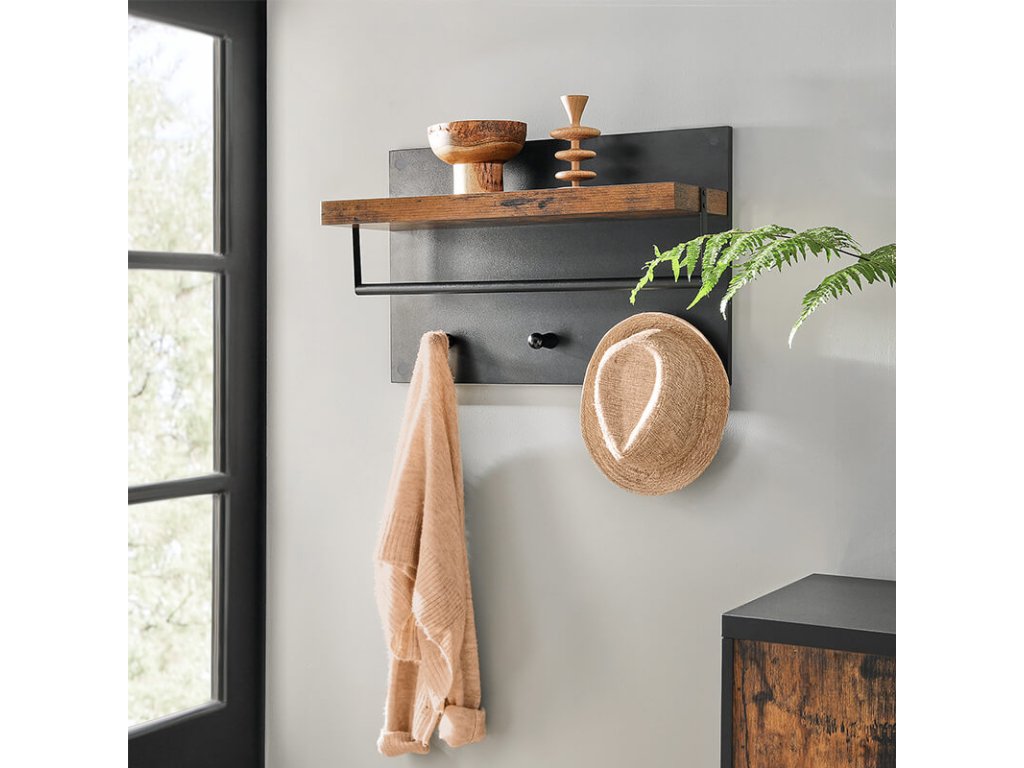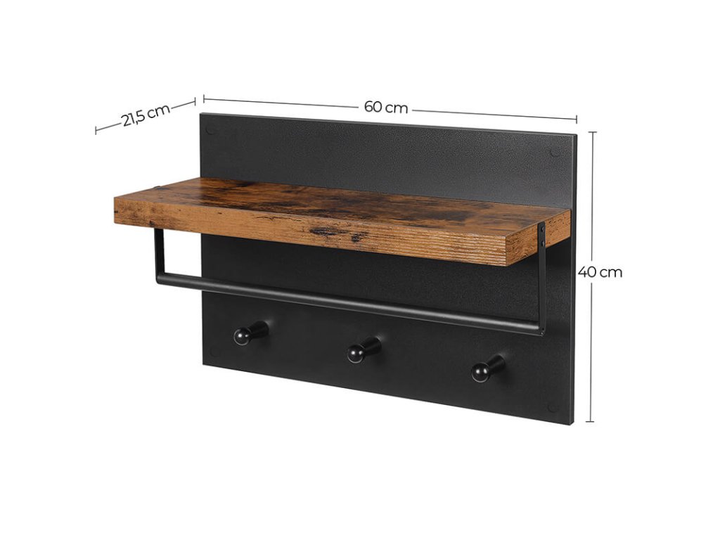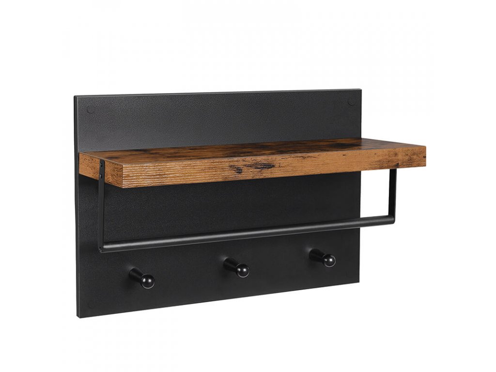Jednoduchý nástěnný věšák s policí v kombinaci hnědé a černé. Praktický a krásný pomocník ve vaší předsíni