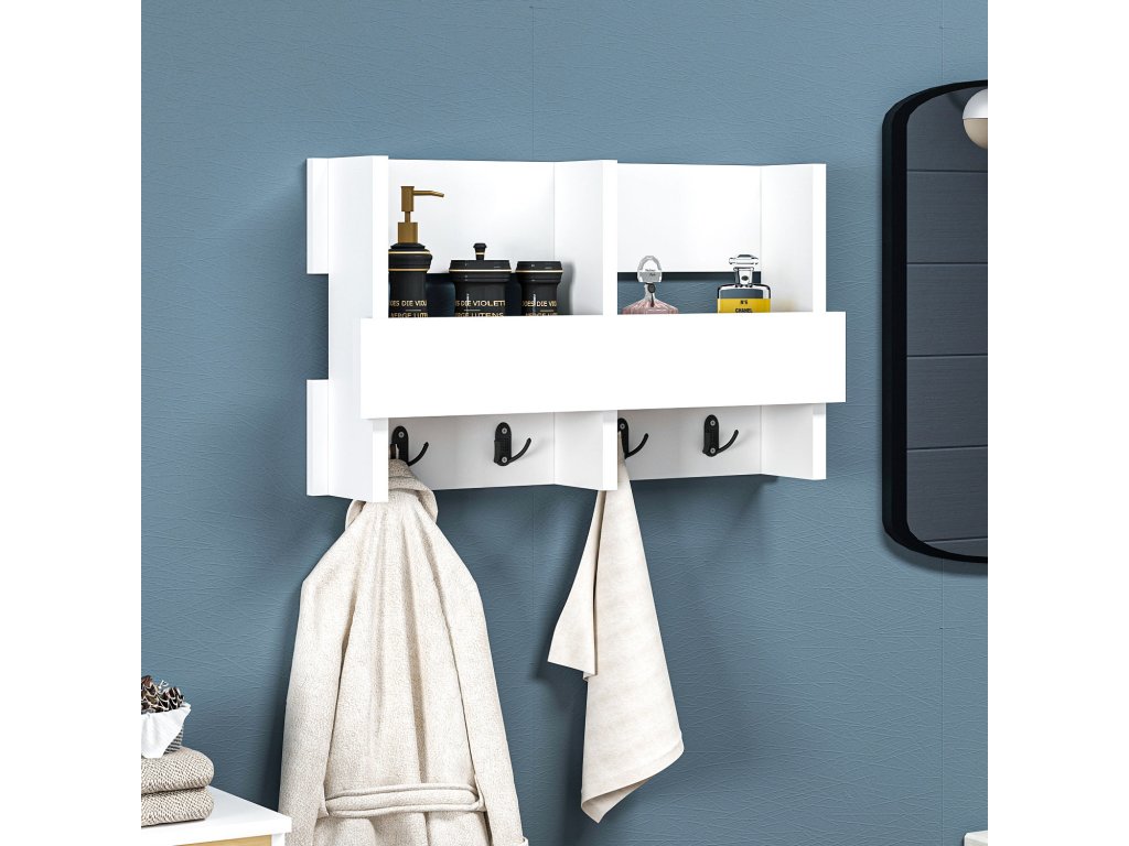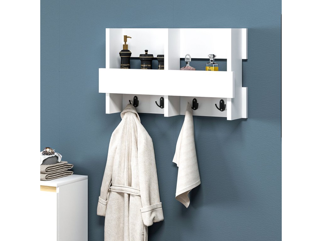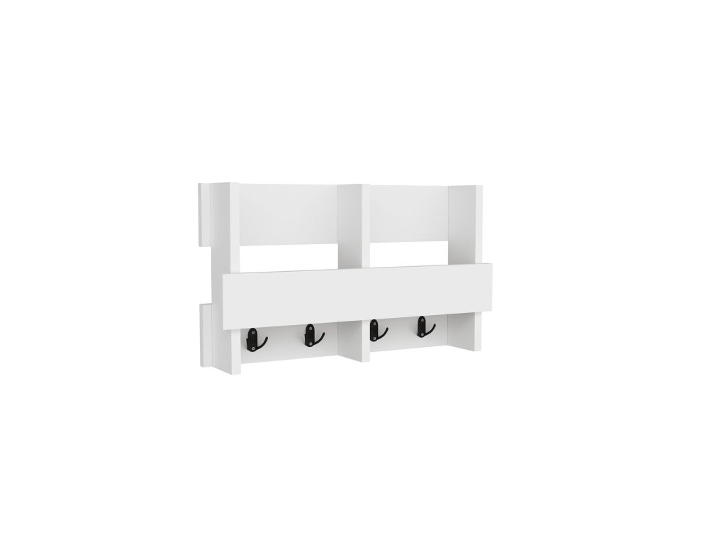 Bílý nástěnný věšák WINK je sestaven z jedné police opatřené zábranou a rozdělené na dvě stejné části a po dní se nachází lišta se čtyřmi dvouháčky.
