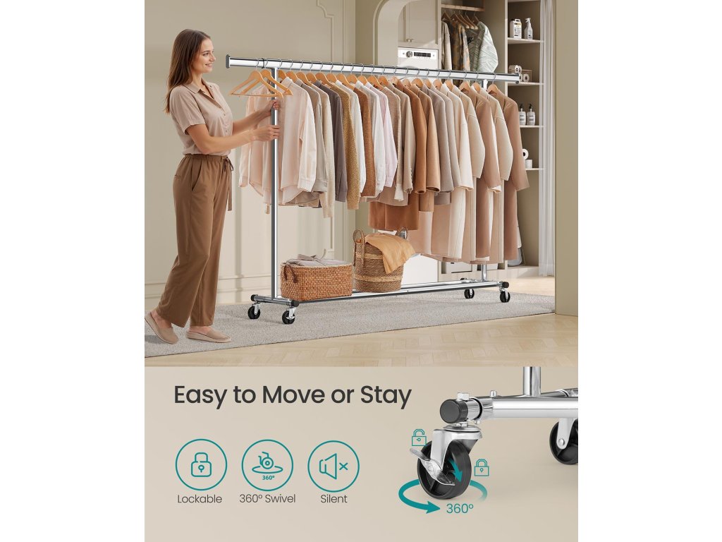 Věšák je vybaven 4 kolečky otočnými o 360°, z toho 2 s brzdou, takže jej můžete snadno přesunout z ložnice do šatny a podle potřeby jej udržet na jednom místě