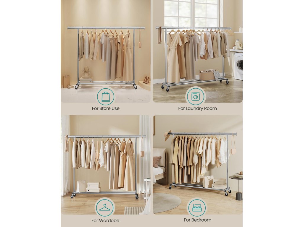 Stojan má nejen tyč na oblečení, ale také 2 spodní tyče pro umístění košů. Hodí se do ložnice na každodenní nošení, do prádelny na praní prádla nebo ven díky chromovanému kovu odolnému proti korozi.
