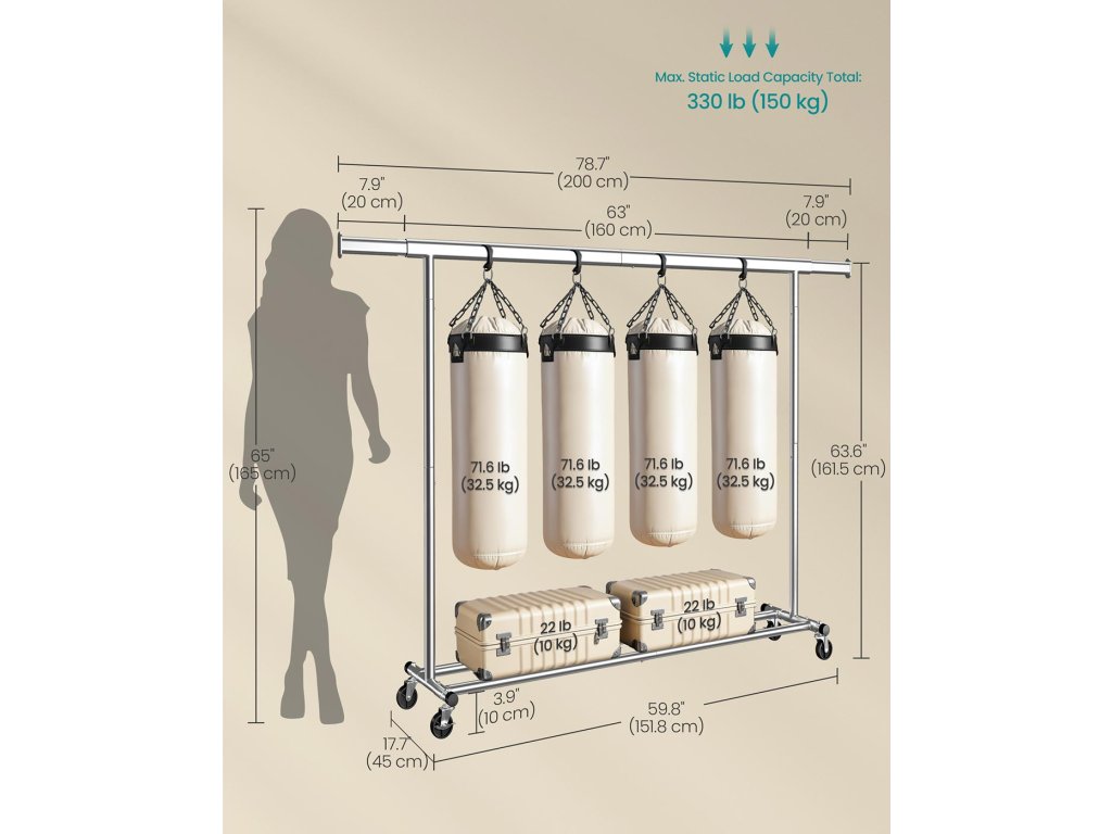 Věšák na oděvy je na obou koncích délkově nastavitelný o 20 cm (délka věšáku na oděvy: 160-200 cm), což poskytuje více prostoru pro zavěšení; tašky, klobouky, šály a další doplňky se vejdou na boční tyče.