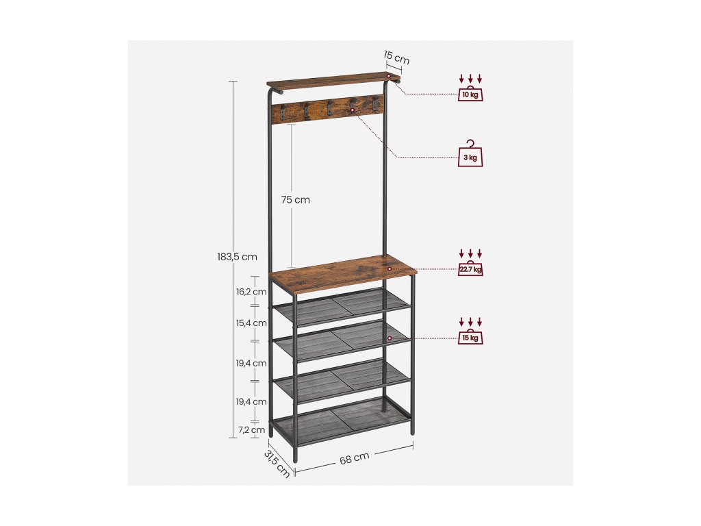 Předsíňový věšák s botníkem 5 polic 68 x 183,5 cm