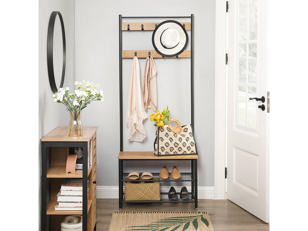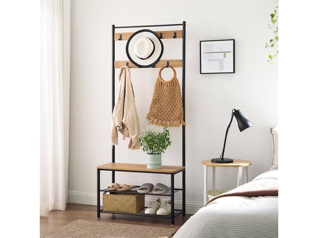 Rustikální a průmyslový design, stojan na kabáty a poličky na boty - tento předsíňový stojan o rozměrech 70 x 32 x 175 cm je ideální pomocník do vstupní chodby.