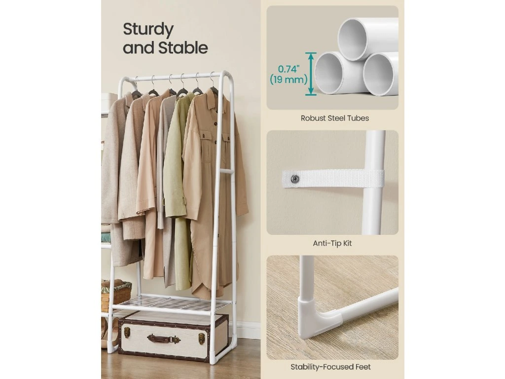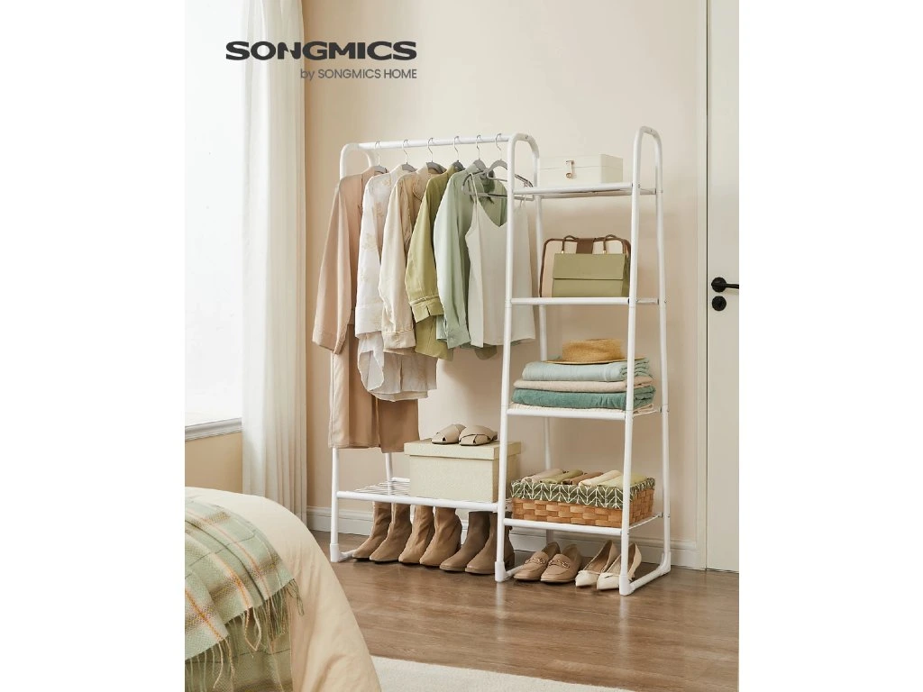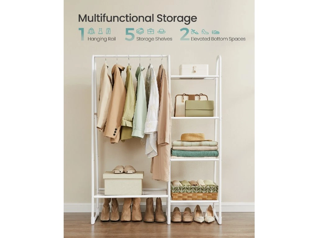 Stojan na oděvy kombinuje lištu pro zavěšení oblečení a úložné regály, což vám umožní uspořádat vaše oblečení, tašky, doplňky a boty na jednom místě, aby vám usnadnil vyhledávání