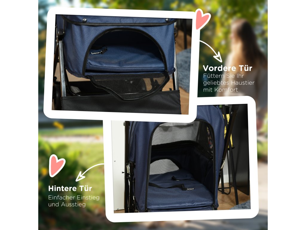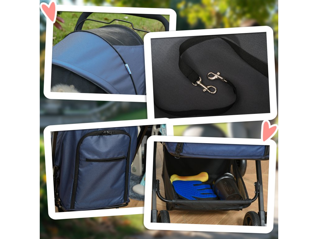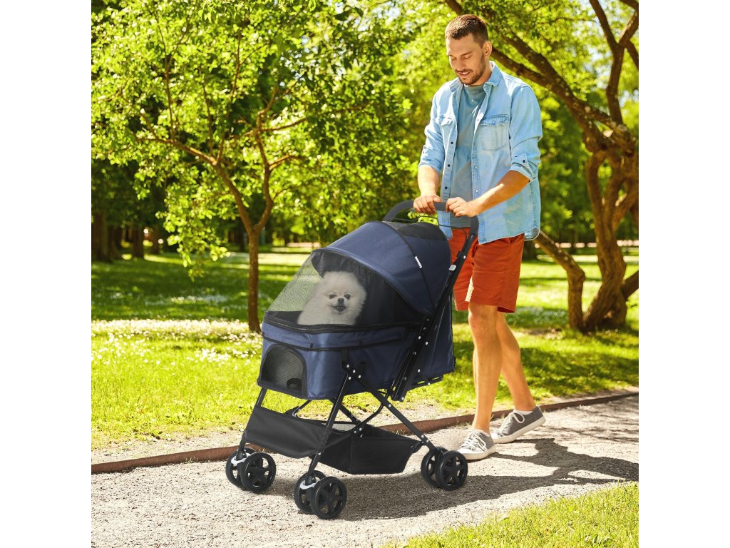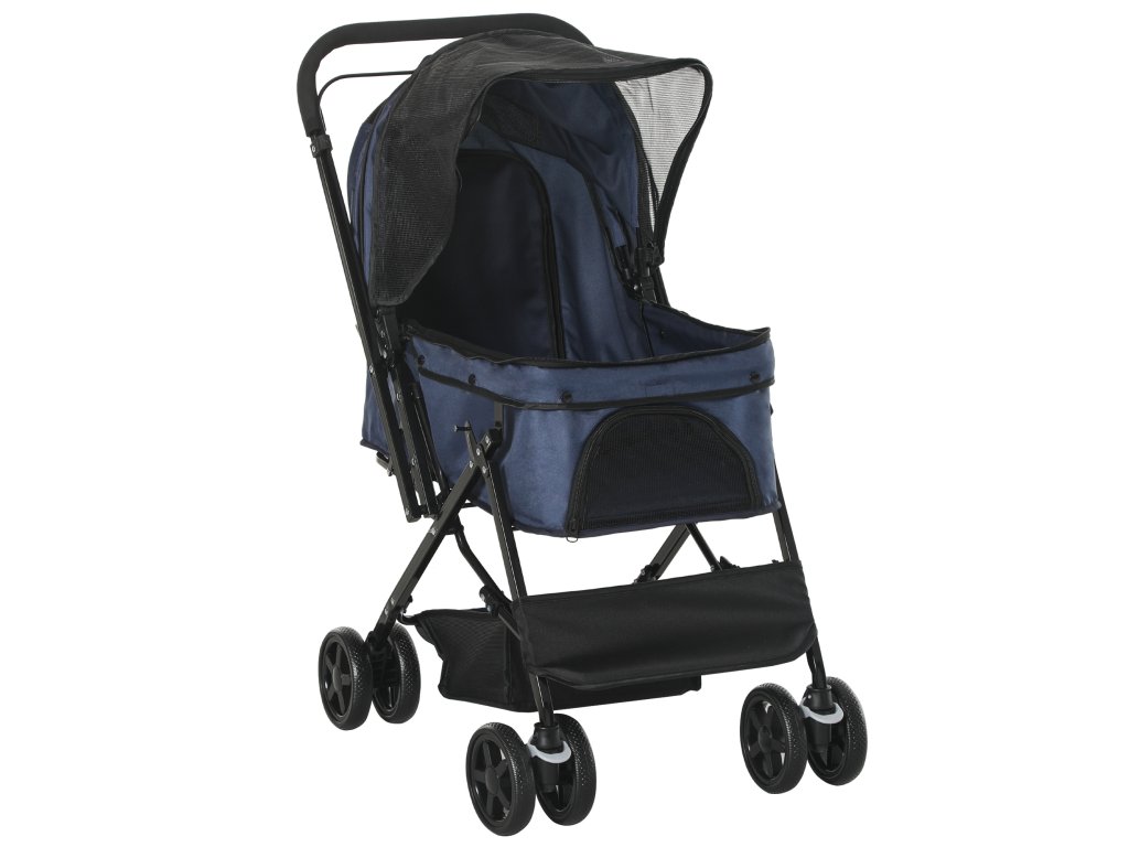 Tmavě modrý kočárek pro domácí mazlíčky.