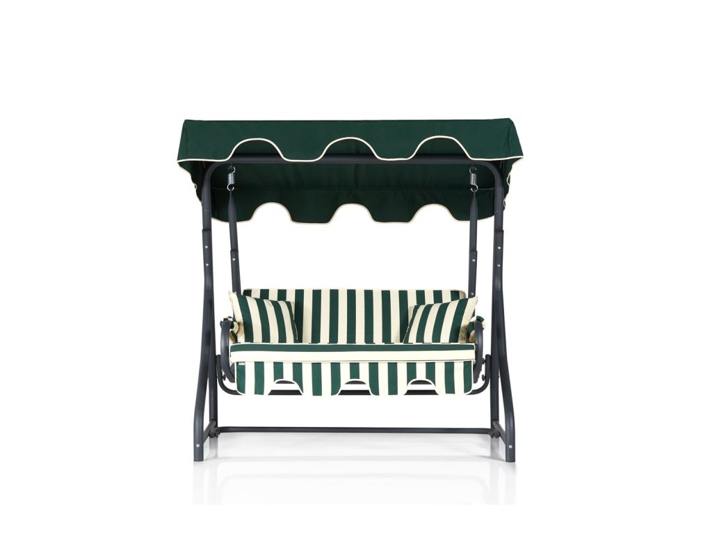 MORUS je zeleno-bílé závěsné houpací křeslo se stříškou usazené v kovovém černém rámu s odnímatelným polstrováním..