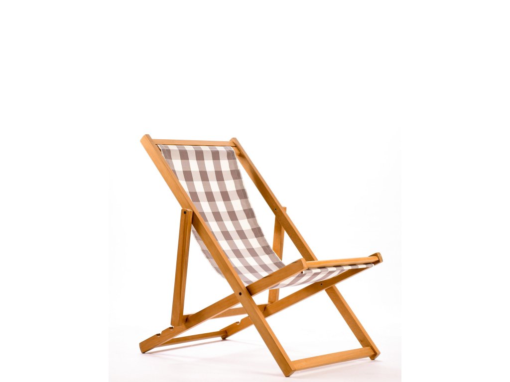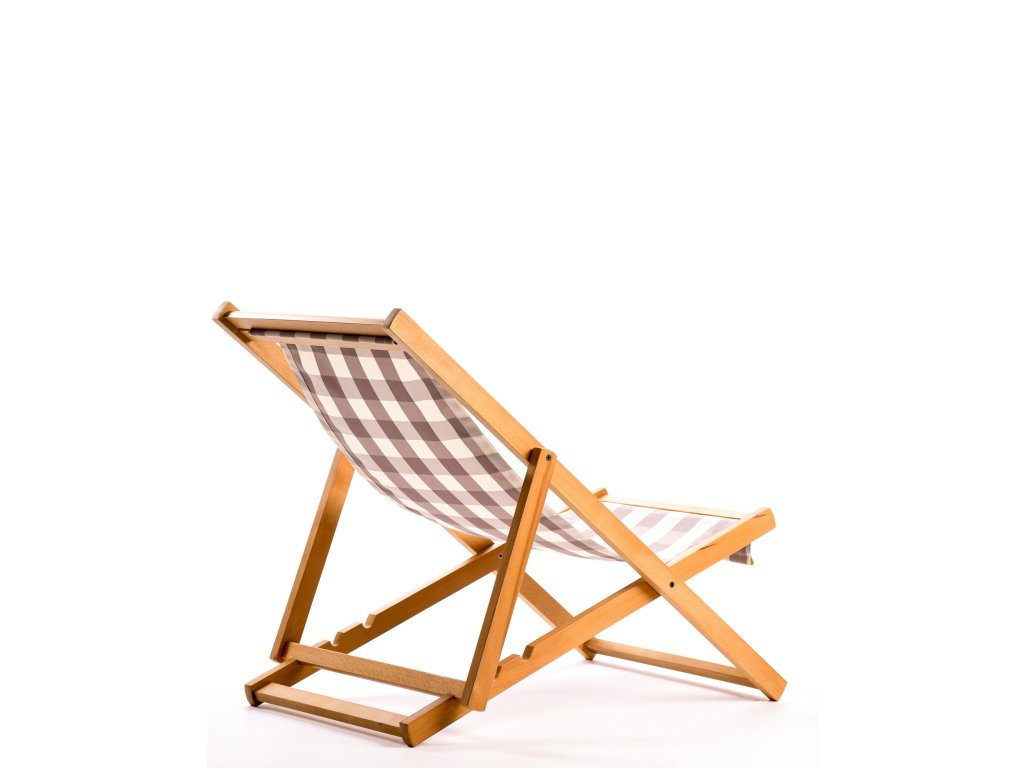 REPOSE BEACH je nastavitelné lehátko vyrobené z bukového dřeva doplněné o hnědo-bílou polyesterovou látku.