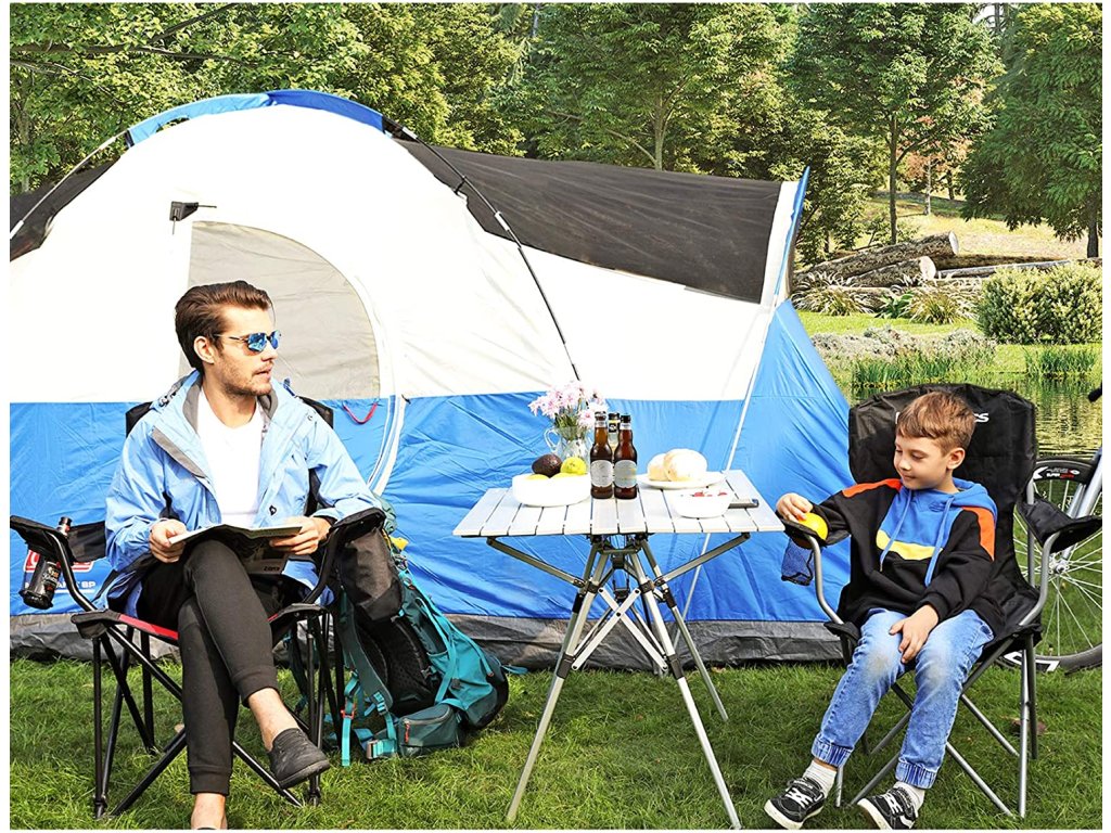 Držák na šálky udržuje váš oblíbený nápoj po ruce a taška na přenášení vám umožní uložit lehké skládací táborové křeslo a nosit ho na rameni.